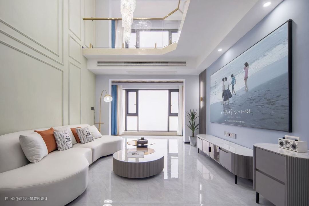 客厅和阳台打通,大玻璃封窗,奶油色不规则沙发,大水晶吊顶,挑高设计,让空间更显开阔大气。