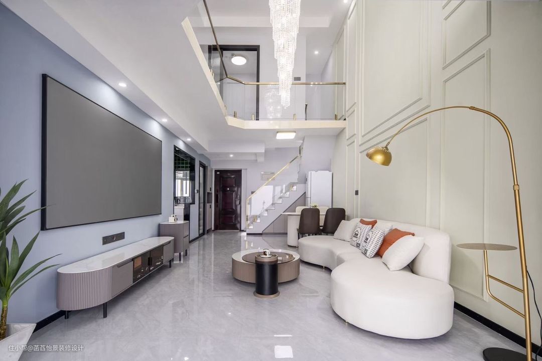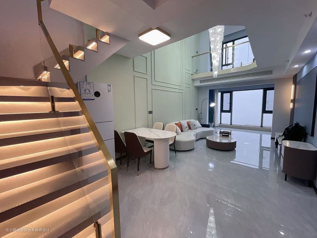 客厅和阳台打通,大玻璃封窗,奶油色不规则沙发,大水晶吊顶,挑高设计,让空间更显开阔大气。