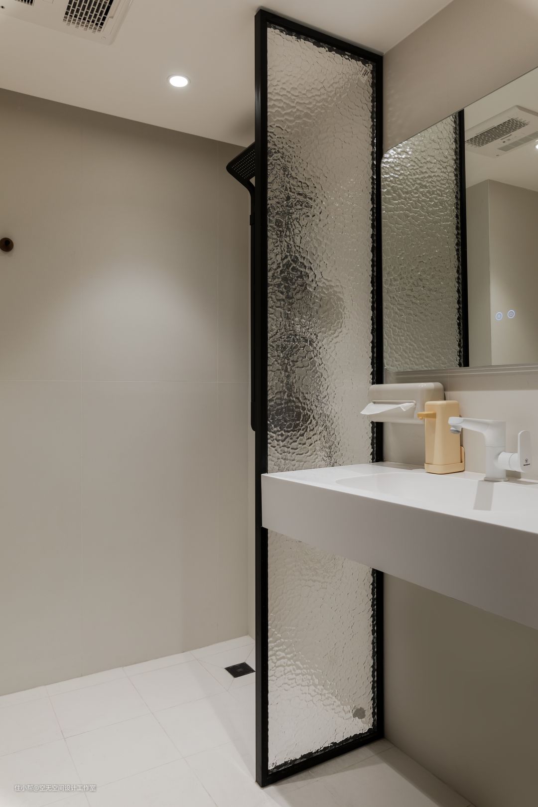 这个小小小的门洞里面,其实是卫生间,这个是专门给猫咪预留的,用于上卫生间,一个专属门!在浴室柜对面设计了洗衣机和烘干机的洗衣区。干湿分区,浴室柜壁挂,下面放猫砂盆,然后淋浴区做单独玻璃,防止淋浴水往外面流,然后同时也会显的空间大。