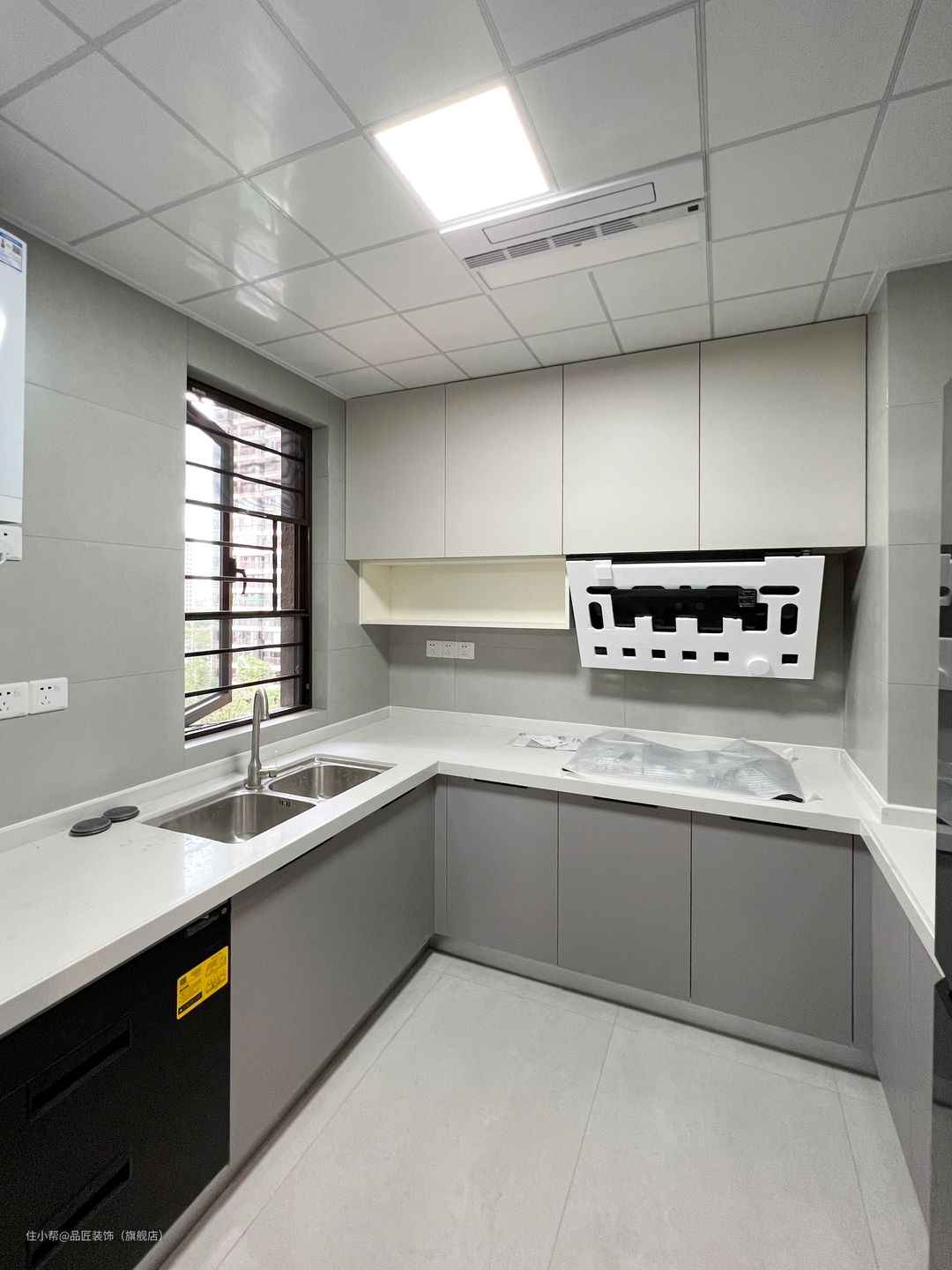 ✦设计亮点✦ 厨房通铺白色瓷砖,做成U型设计,遵循了拿菜-洗菜-切菜-炒菜-放菜动线,各个设计都考虑到了下厨的动线,使得厨房变得更加便利顺手。 台下台上均设置橱柜,U型右侧还放置了冰箱,收纳俱全,让瓶瓶罐罐统一规划,视觉效果也很宽敞。
