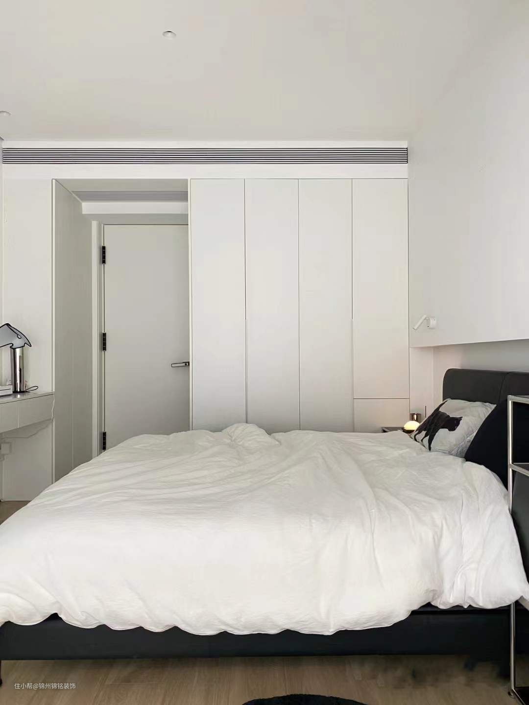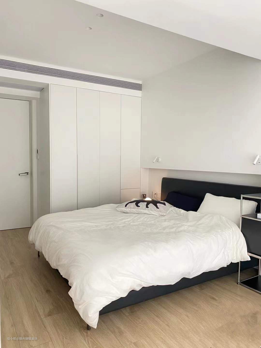 大平顶+无主灯设计,靠窗一侧预留了窗帘盒,内嵌氛围灯带。乳胶漆选择与门板同色的颜色,不会出现五颜六色的白。地面选用燕麦色木纹砖搭配大白墙,非常简单清爽。柜门都做了通顶的隐形门,整体简洁大气。