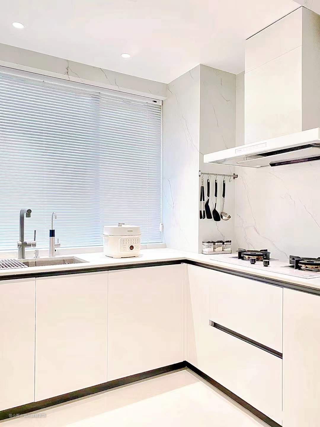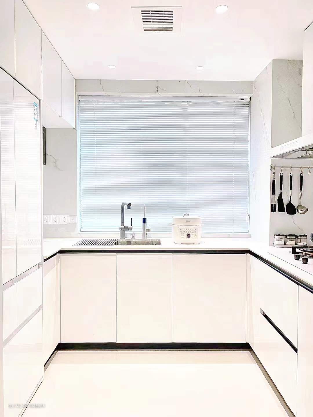 u字型厨房,各类厨房电器收纳俱全。遵循拿菜-洗菜-切菜-炒菜-放菜动线。橱柜颜色选用浅色系,空间会更明亮。收纳空间充分利用,不浪费每一个角落。吊顶做防水石膏板搭配射灯,高级感满满 台面与墙面尽量选用同一块岩板,不做挡水条,不做下挂。厨房地面尽量选用大砖选与餐厅瓷砖通铺,整体会更大气,视觉上更通透。