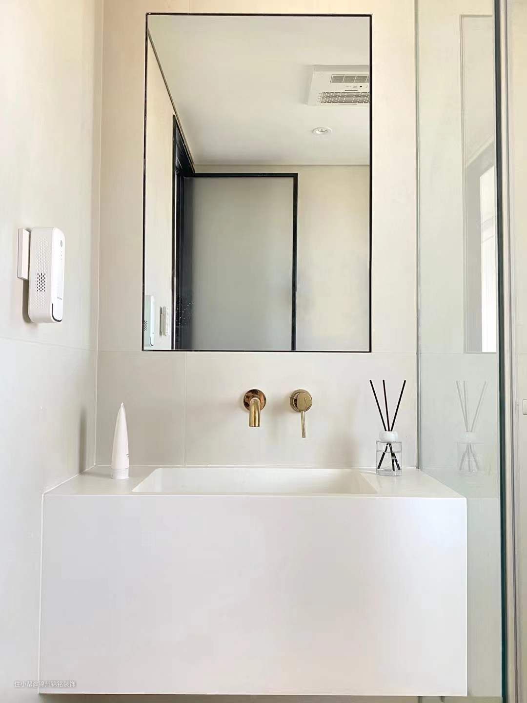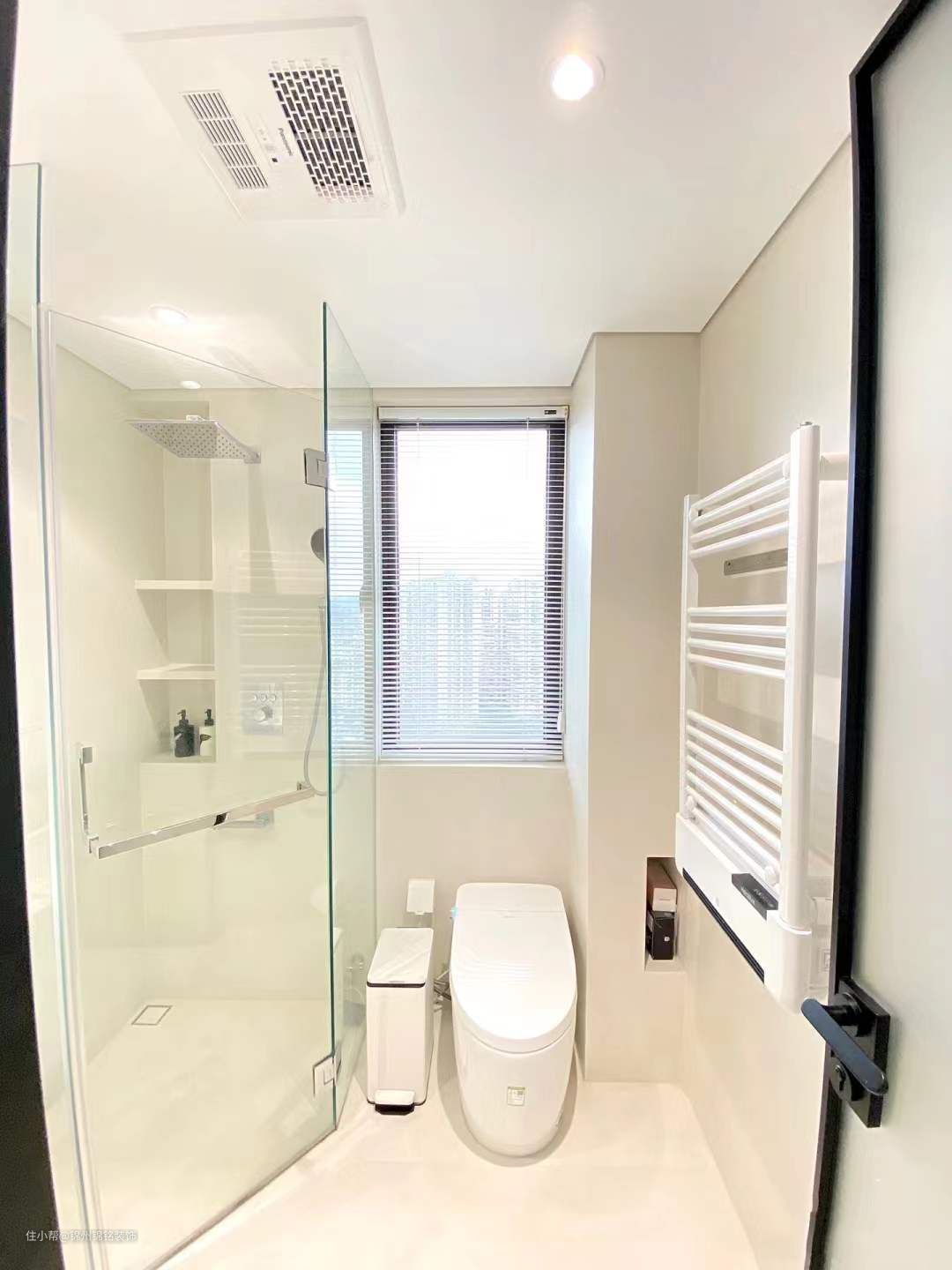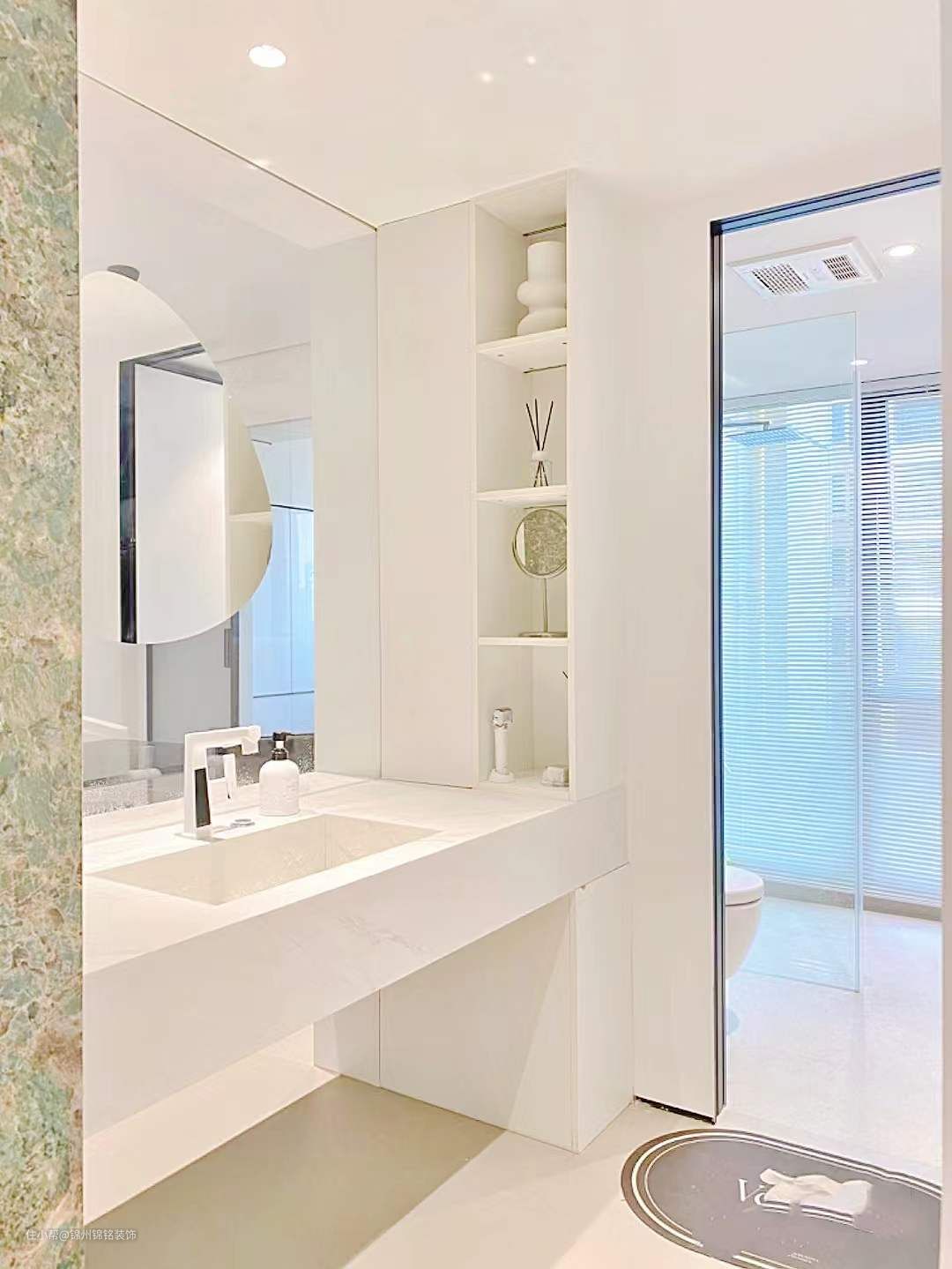 柔光转墙地一体,比起小砖缝隙比较小,整体空间感更好,干净又显大。防水石膏板吊顶,四周围预埋了1cm悬浮型材 -防水深 射灯。3个5w防水射灯,色温3500k。