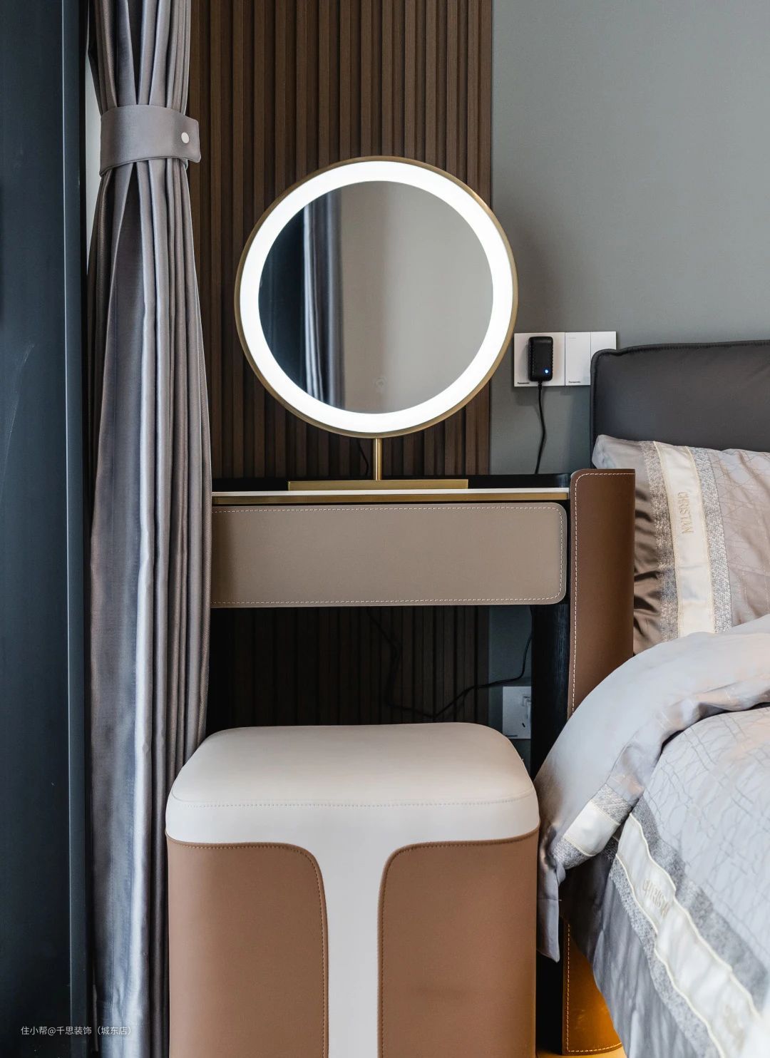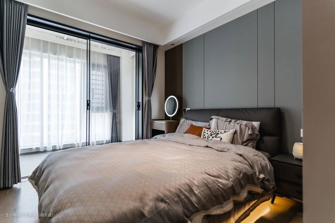 ▲ 延续公共空间风格色彩,深灰色护墙板+木饰面格栅硬包充当背景,一侧定制整面嵌入式收纳柜,搭配舒适的床品凸显高级质感。