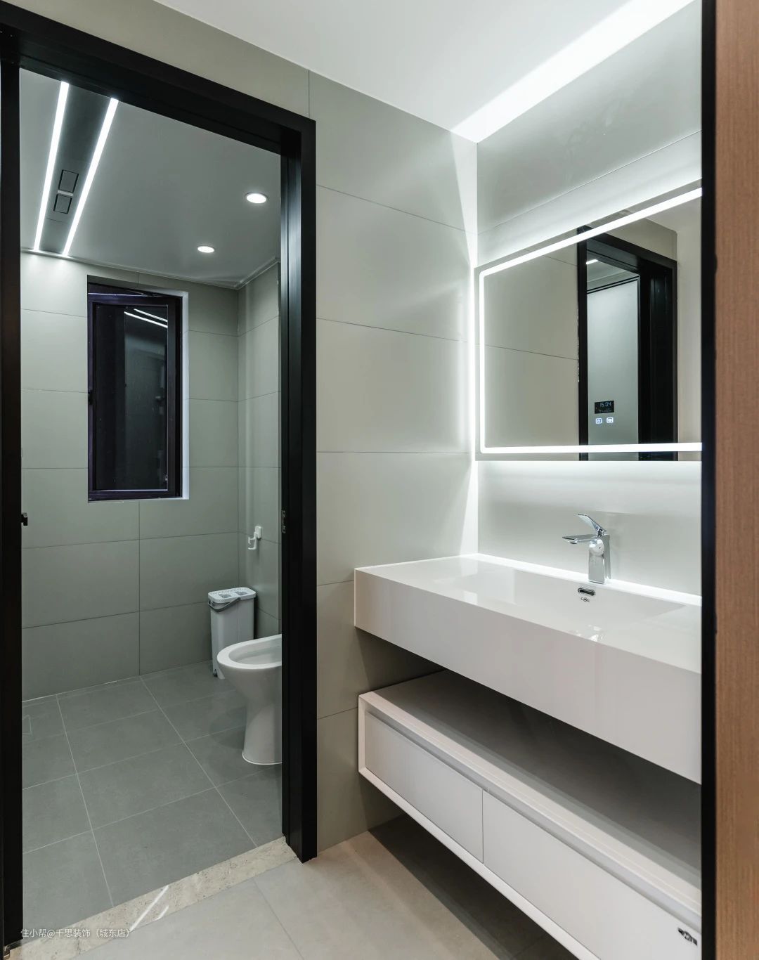 ▲ 卫生间干区外移,自然实现干湿分离,明净的岩板一体台盆,大气不留卫生死角,底部的悬空抽屉也十分方便收纳。