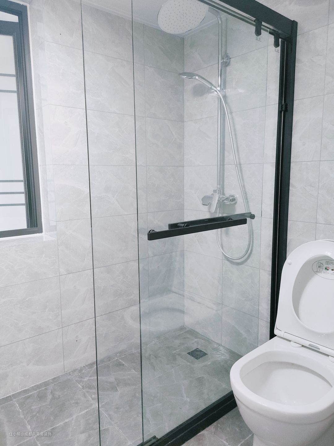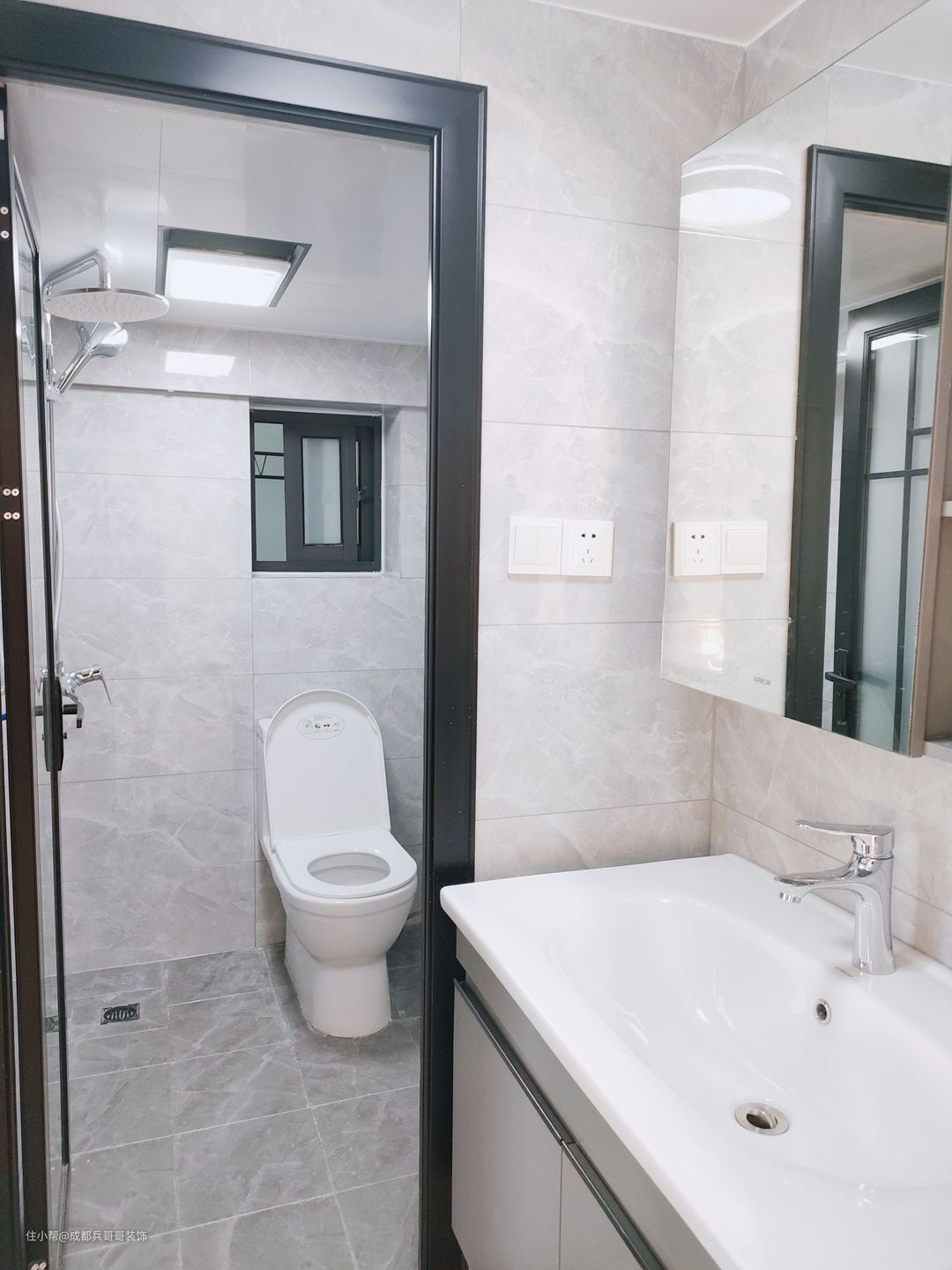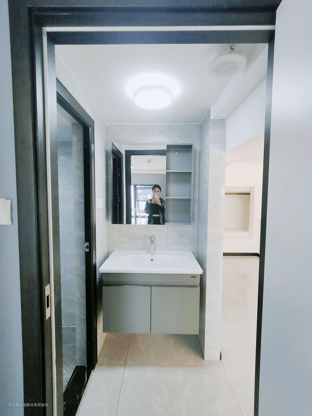 一二楼都设计的有卫生间,都是干湿分离得格局,外面浴室柜,里面是淋浴+马桶区,满足基本生活功能。墙砖、瓷砖同样通铺开来,浅灰色+白色设计,简洁又明亮,室内空间素雅、干净。