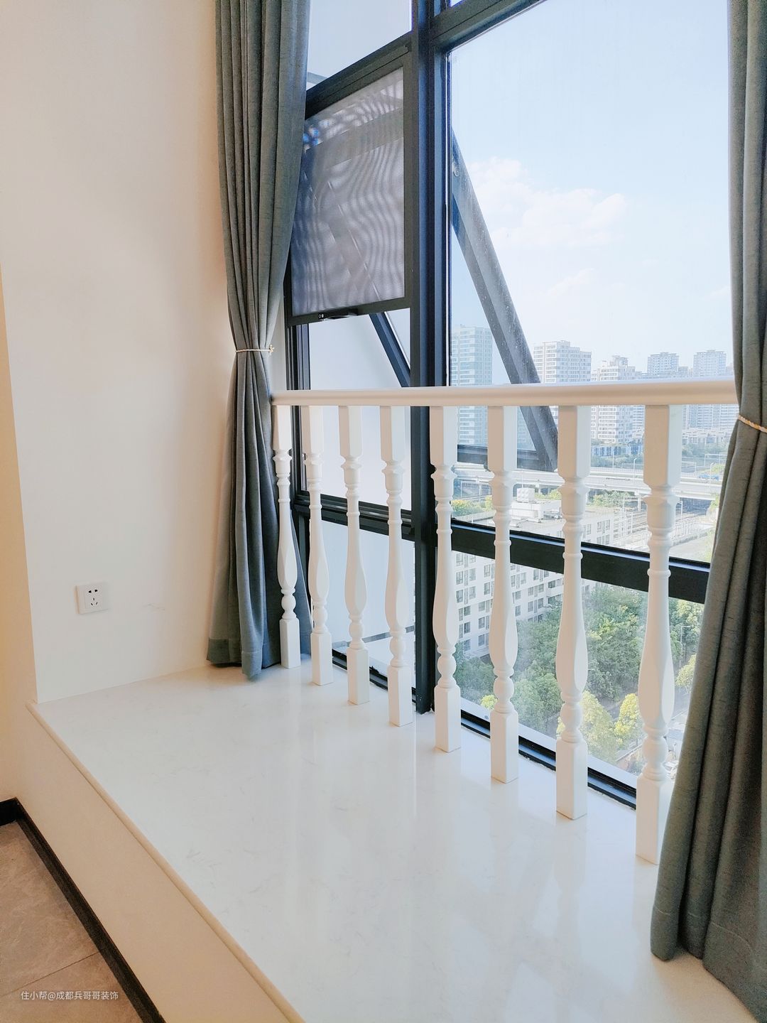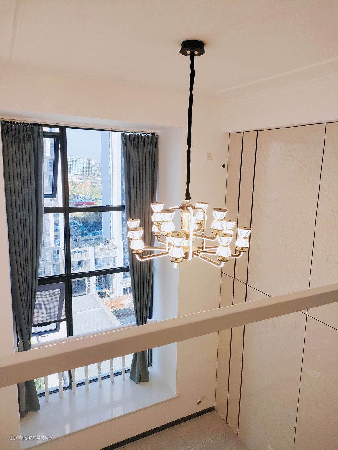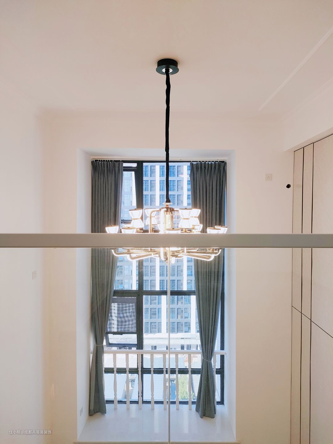 客厅,设计在镂空区域,拥有4米多的绝佳挑空感,给人带来的视野感辽阔、大气。 值得注意的是,沙发背景墙选用白色乳胶漆涂刷,电视背景墙则选用高光岩板拼接式设计,在不违背整体风格的前提下,节省成本又高端上档次。灯饰上,搭配的是复古式烛台水晶灯,营造出温馨浪漫的氛围感~~✨✨ 客厅保留了全景窗户,保证了室内的良好采光,设计师还贴心地设计了扶手护栏,生活安全性有效提高。飘窗台能改造成简单的休憩空间,闲暇时欣赏窗外的美景,放松身心也不错~~