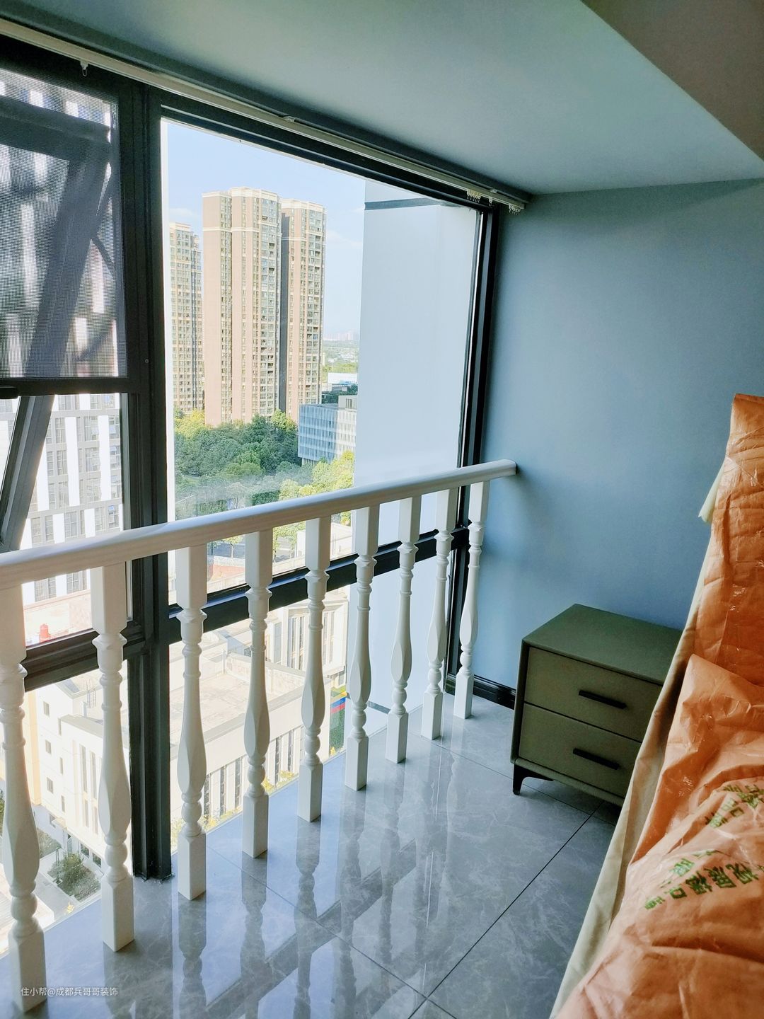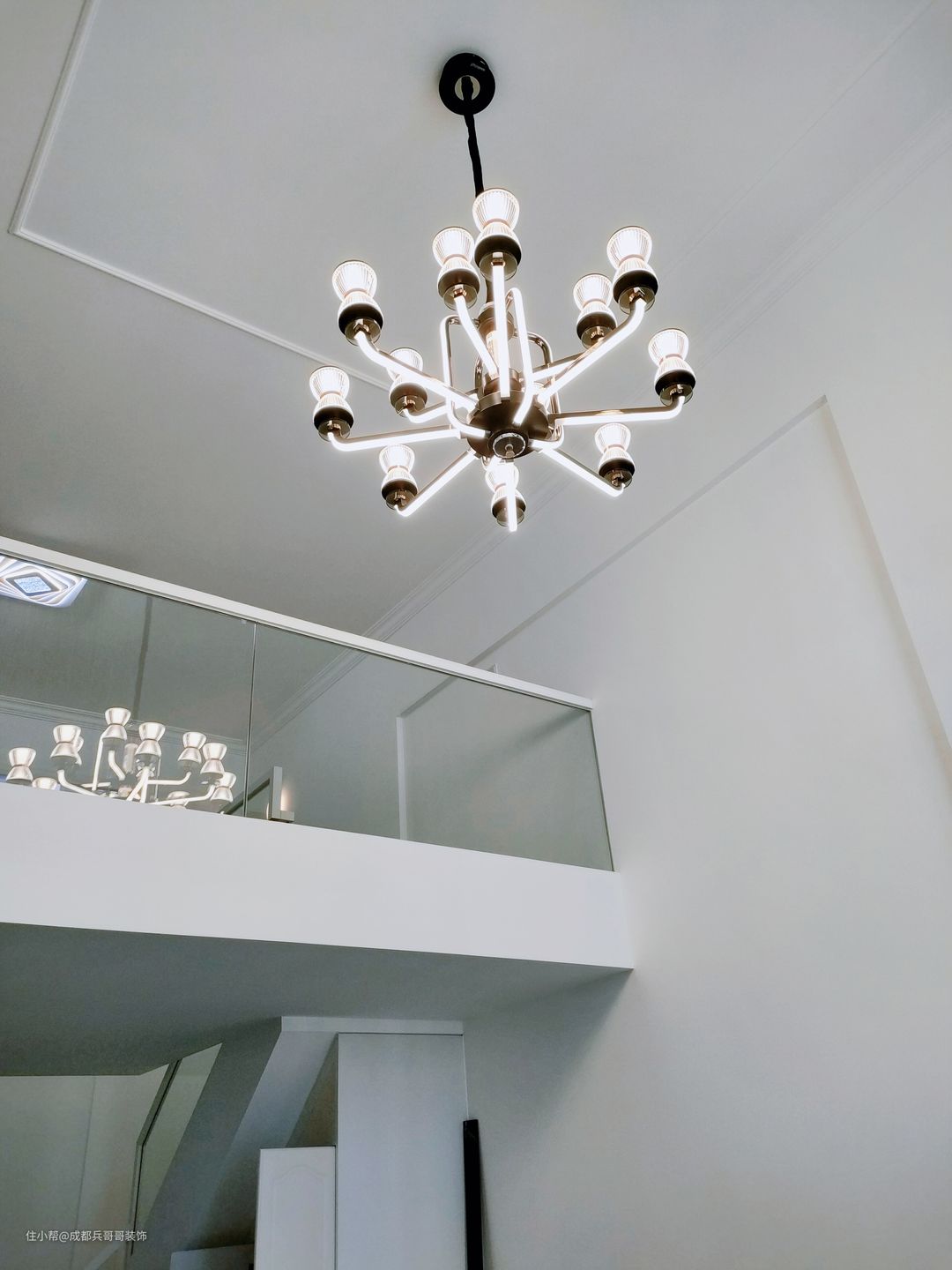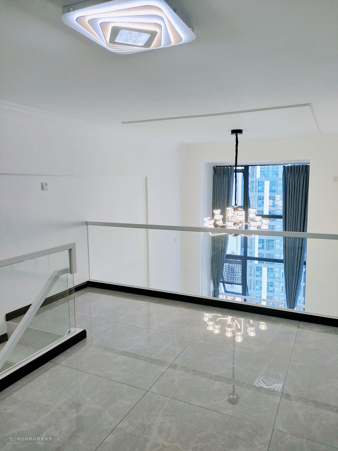 客厅,设计在镂空区域,拥有4米多的绝佳挑空感,给人带来的视野感辽阔、大气。 值得注意的是,沙发背景墙选用白色乳胶漆涂刷,电视背景墙则选用高光岩板拼接式设计,在不违背整体风格的前提下,节省成本又高端上档次。灯饰上,搭配的是复古式烛台水晶灯,营造出温馨浪漫的氛围感~~✨✨ 客厅保留了全景窗户,保证了室内的良好采光,设计师还贴心地设计了扶手护栏,生活安全性有效提高。飘窗台能改造成简单的休憩空间,闲暇时欣赏窗外的美景,放松身心也不错~~