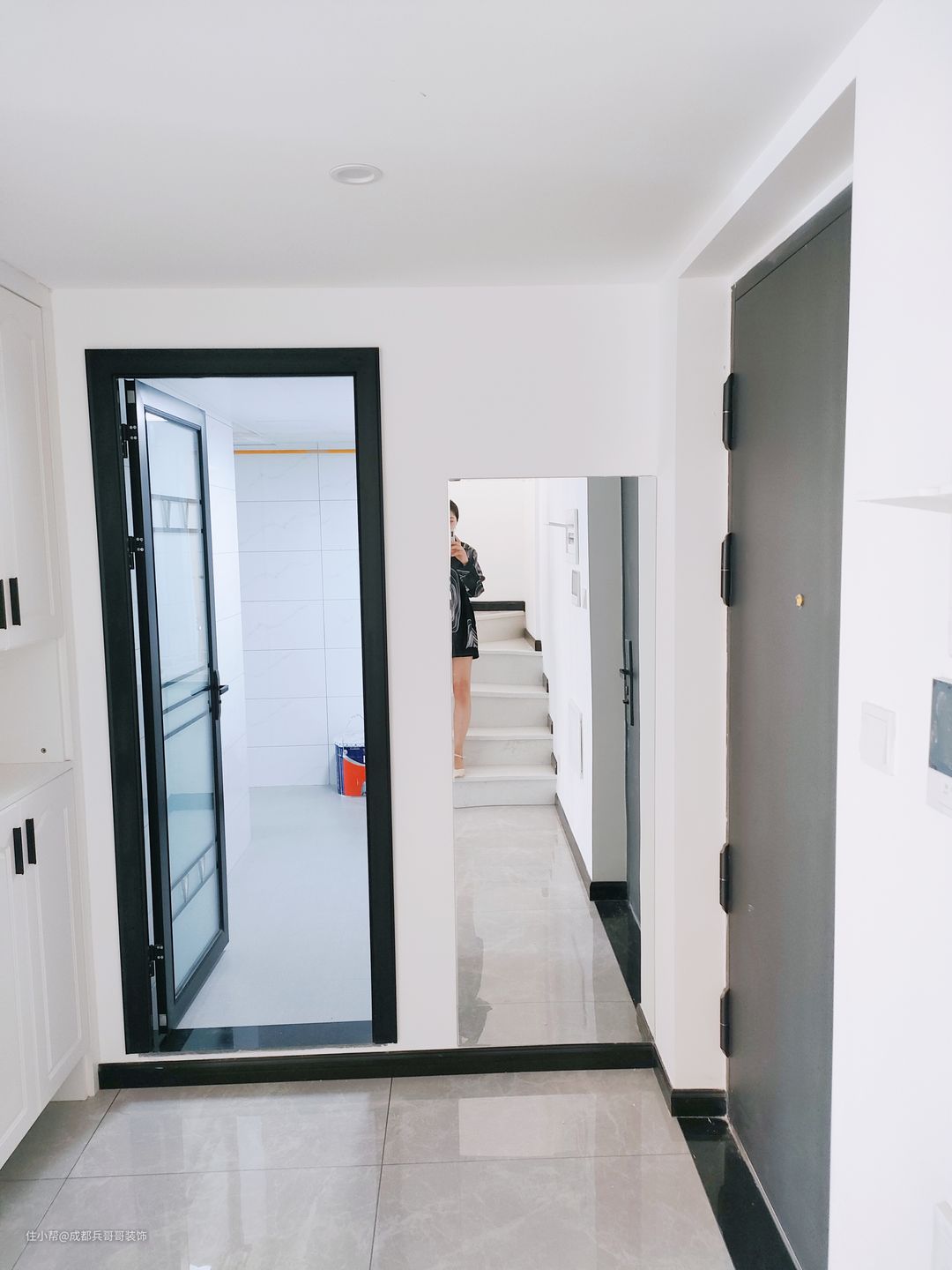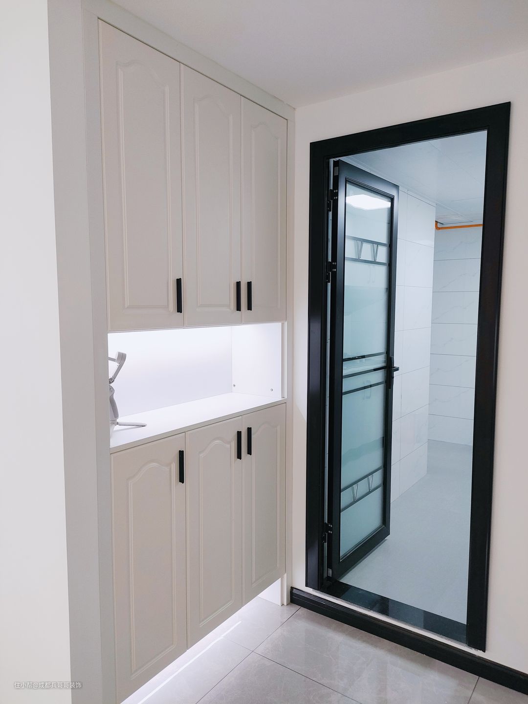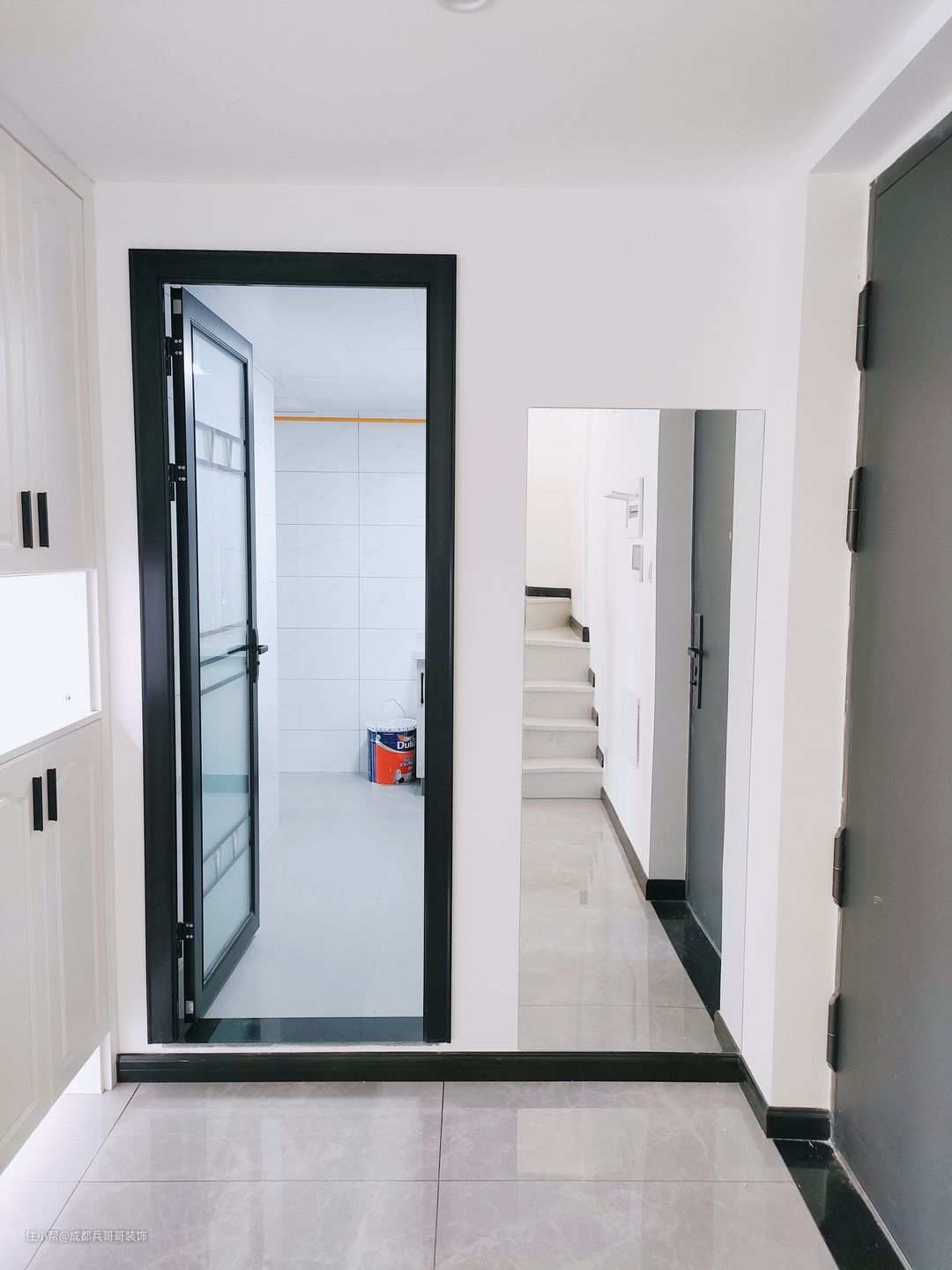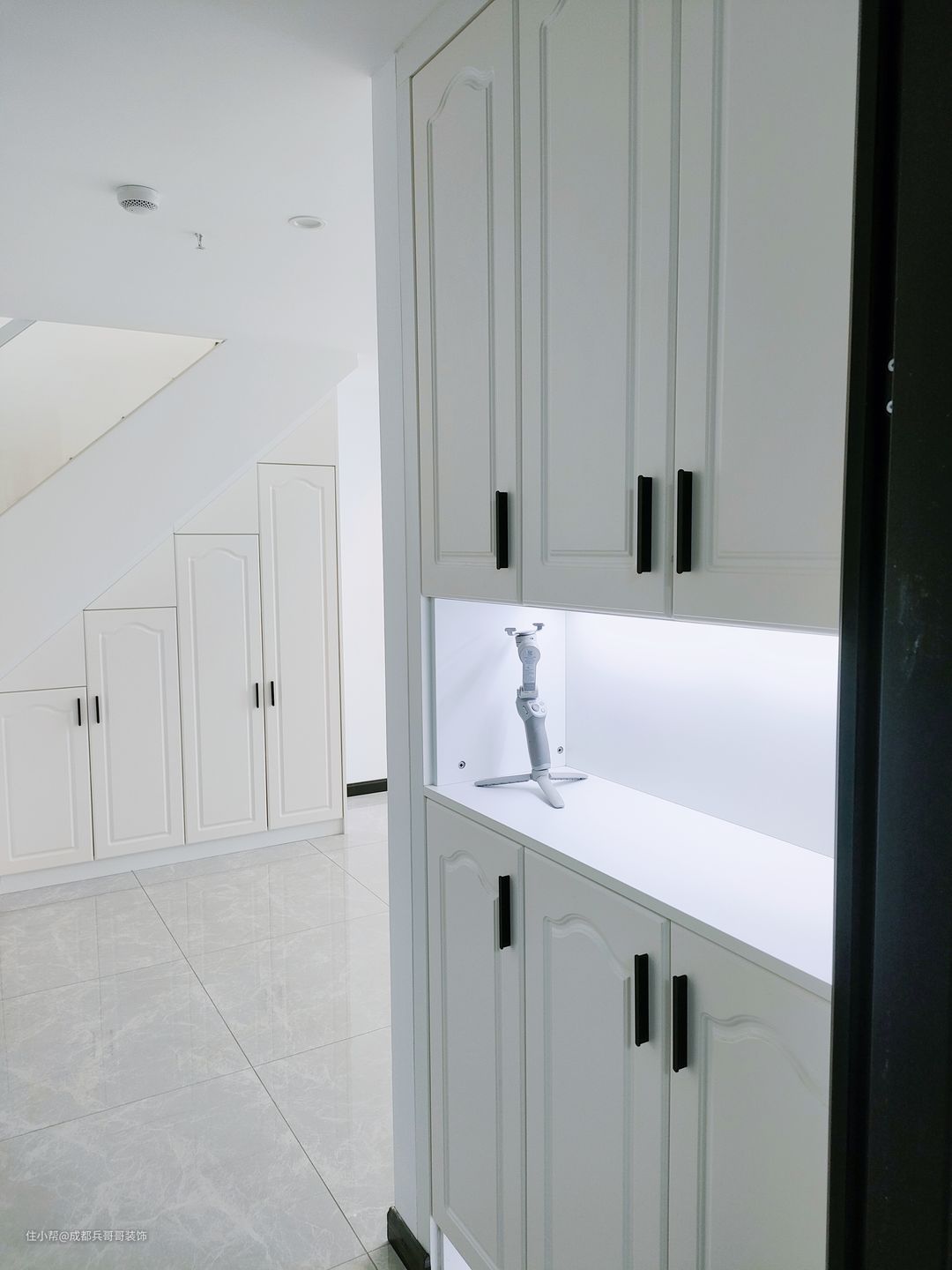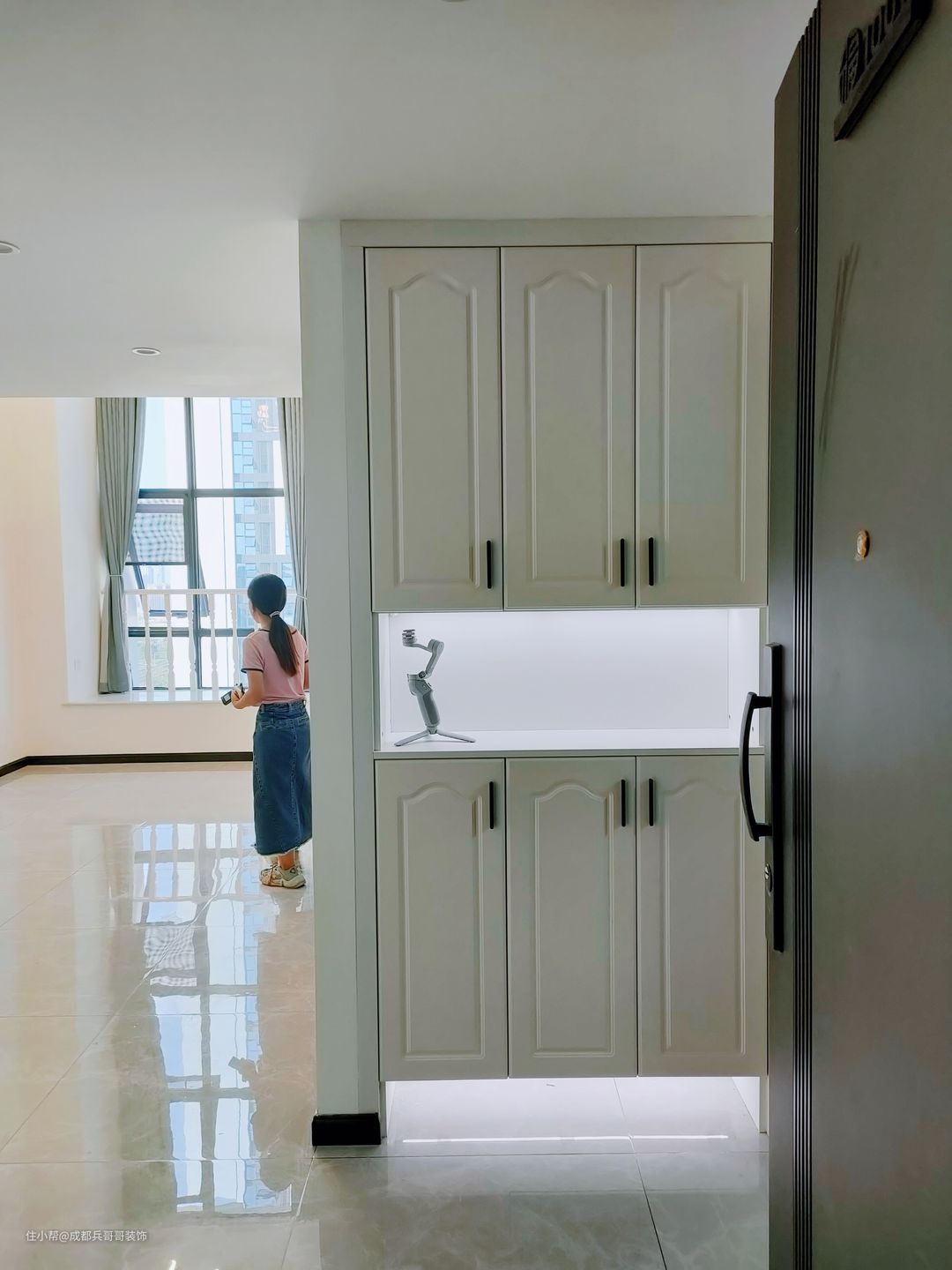 公寓入户设计,往往注重鞋柜的格局,由于面积有限,入户空间巧妙利用变得很重要! 一起来看看这套loft入户空间是如何设计的呢🔻🔻 进门便能看到通顶玄关柜,中间镂空35公分,方便储放日常物品,或者绿植、摆件装饰品等。底部镂空15公分,换鞋穿鞋很便捷,清洁打扫也毫不费力。搭配了氛围灯条,看上去更好看,空间感更明亮。玄关柜门选用简约白门板+黑色拉手,经典色彩设计,雅致又自然~~🏝 可以看到,进门右手边一堵白墙上,设计师设计了全身镜,出门打扮的美美哒,拥有一整天的好心情,很棒~~👍