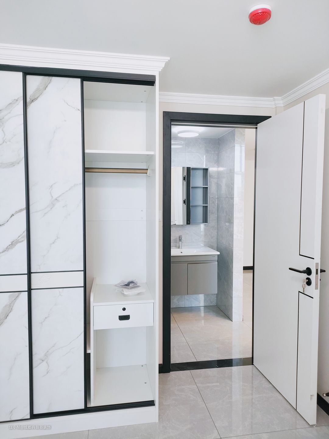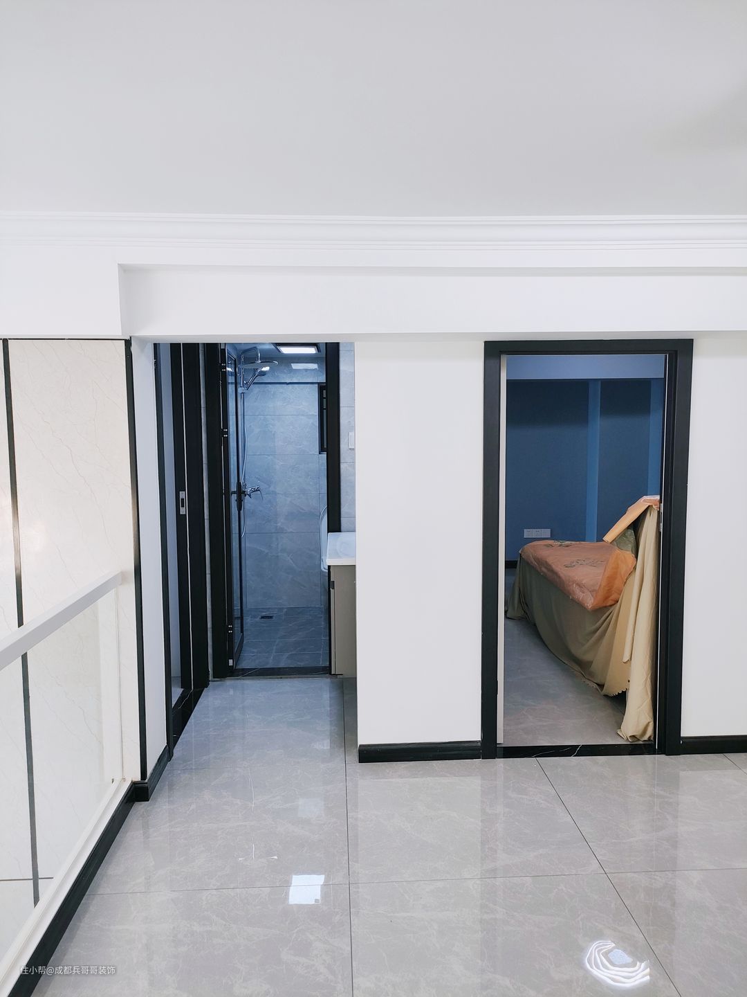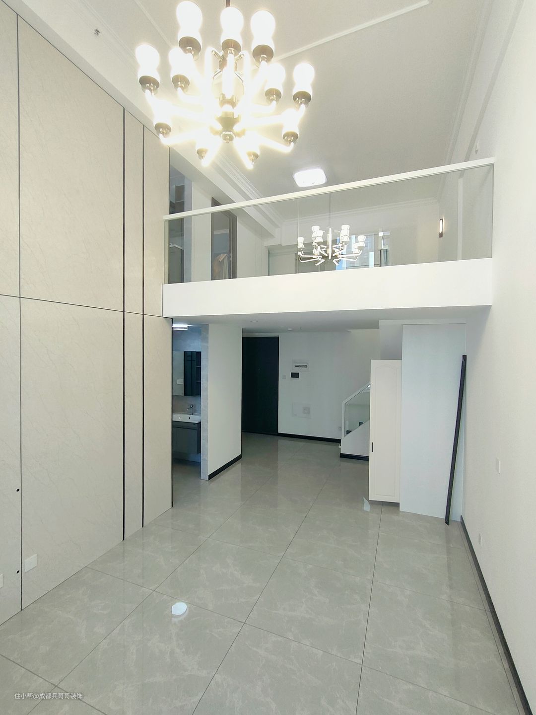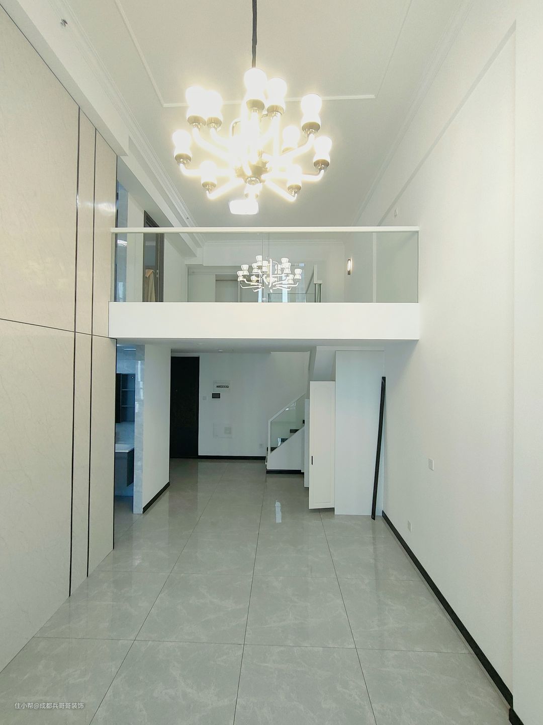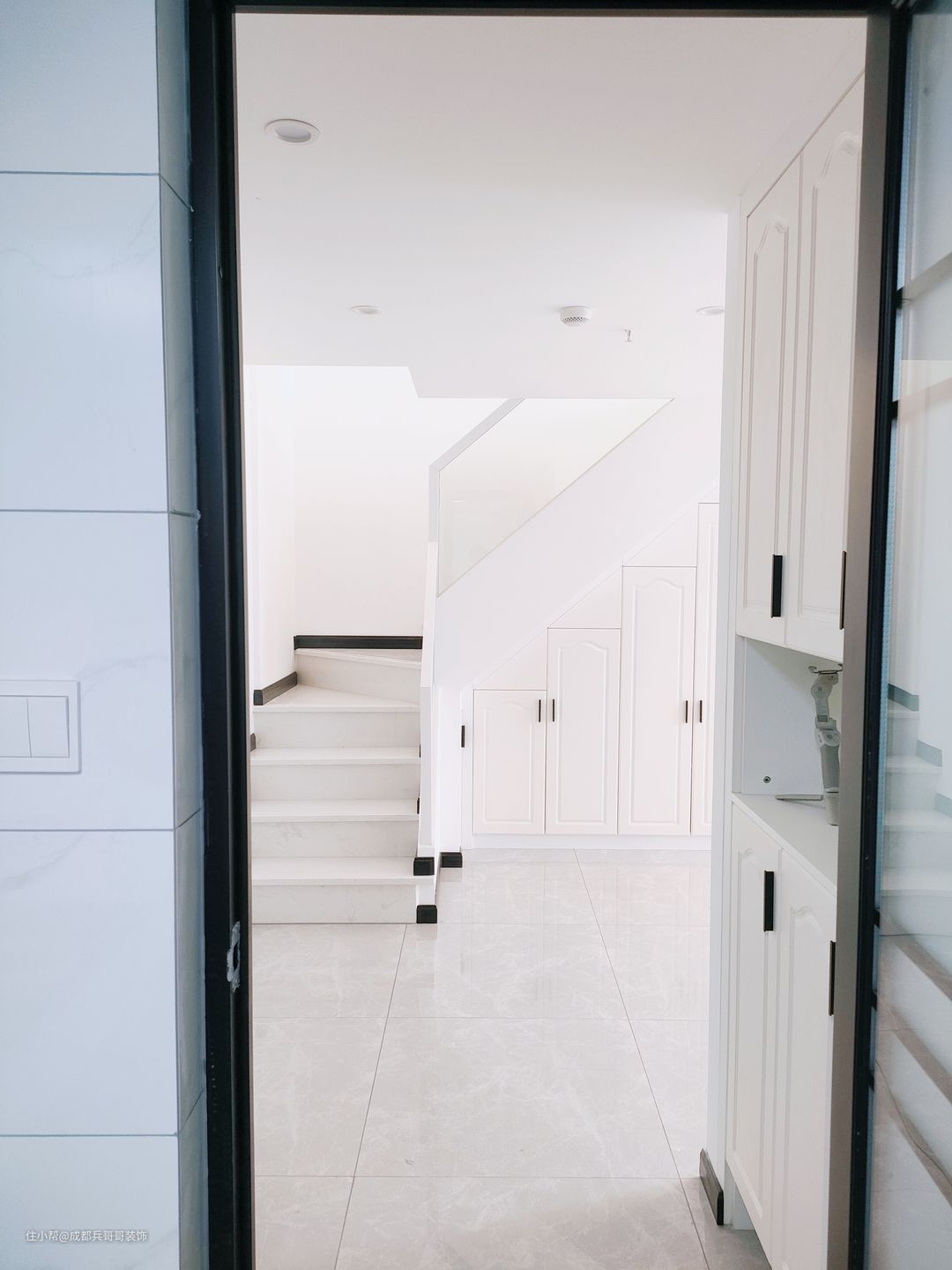 公寓入户设计,往往注重鞋柜的格局,由于面积有限,入户空间巧妙利用变得很重要! 一起来看看这套loft入户空间是如何设计的呢🔻🔻 进门便能看到通顶玄关柜,中间镂空35公分,方便储放日常物品,或者绿植、摆件装饰品等。底部镂空15公分,换鞋穿鞋很便捷,清洁打扫也毫不费力。搭配了氛围灯条,看上去更好看,空间感更明亮。玄关柜门选用简约白门板+黑色拉手,经典色彩设计,雅致又自然~~🏝 可以看到,进门右手边一堵白墙上,设计师设计了全身镜,出门打扮的美美哒,拥有一整天的好心情,很棒~~👍