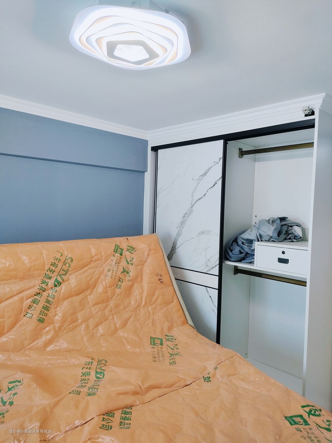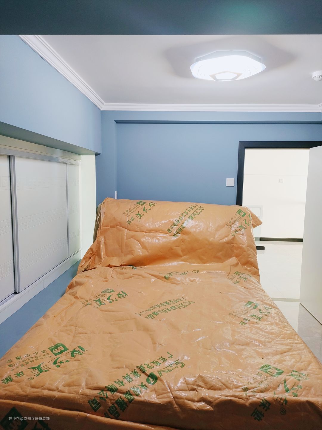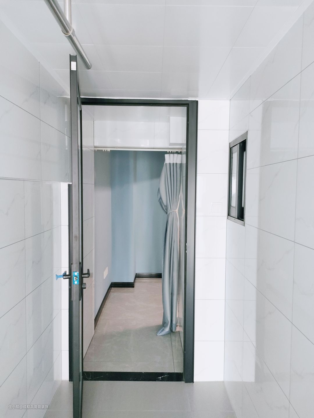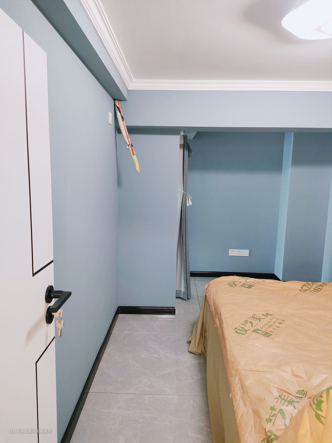 儿童房,设计在2楼里侧,巧妙利用赠送的过道空间,改造成衣物收纳区,放置一米五的床,最里面还拥有独立阳台,功能十分全面。 墙面选用蓝色乳胶漆上墙,与简约白搭配,舒适又自然~~
