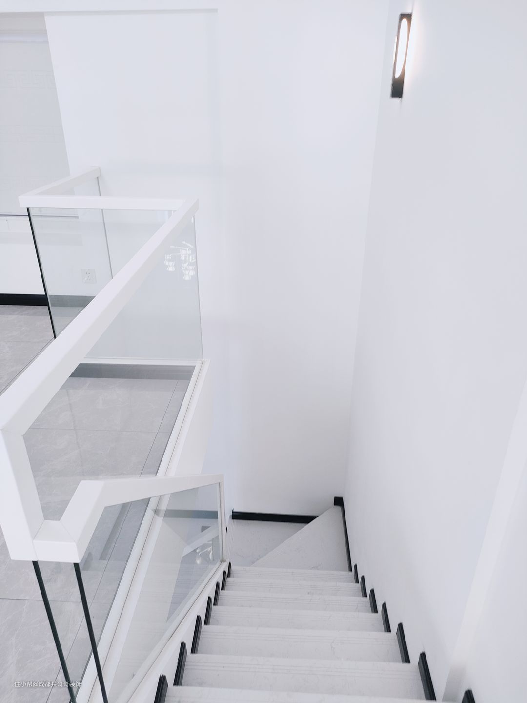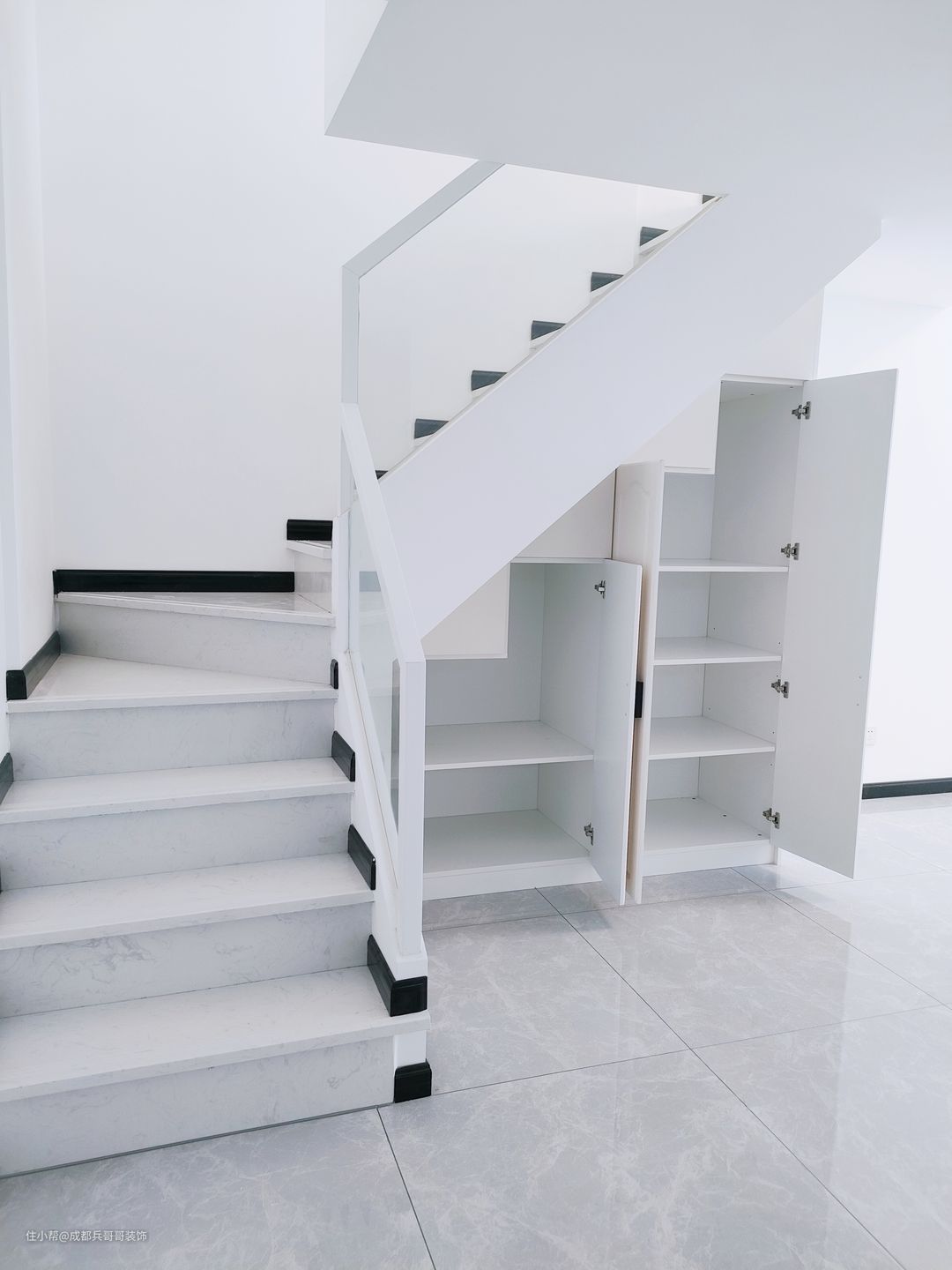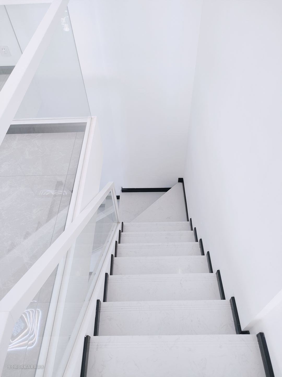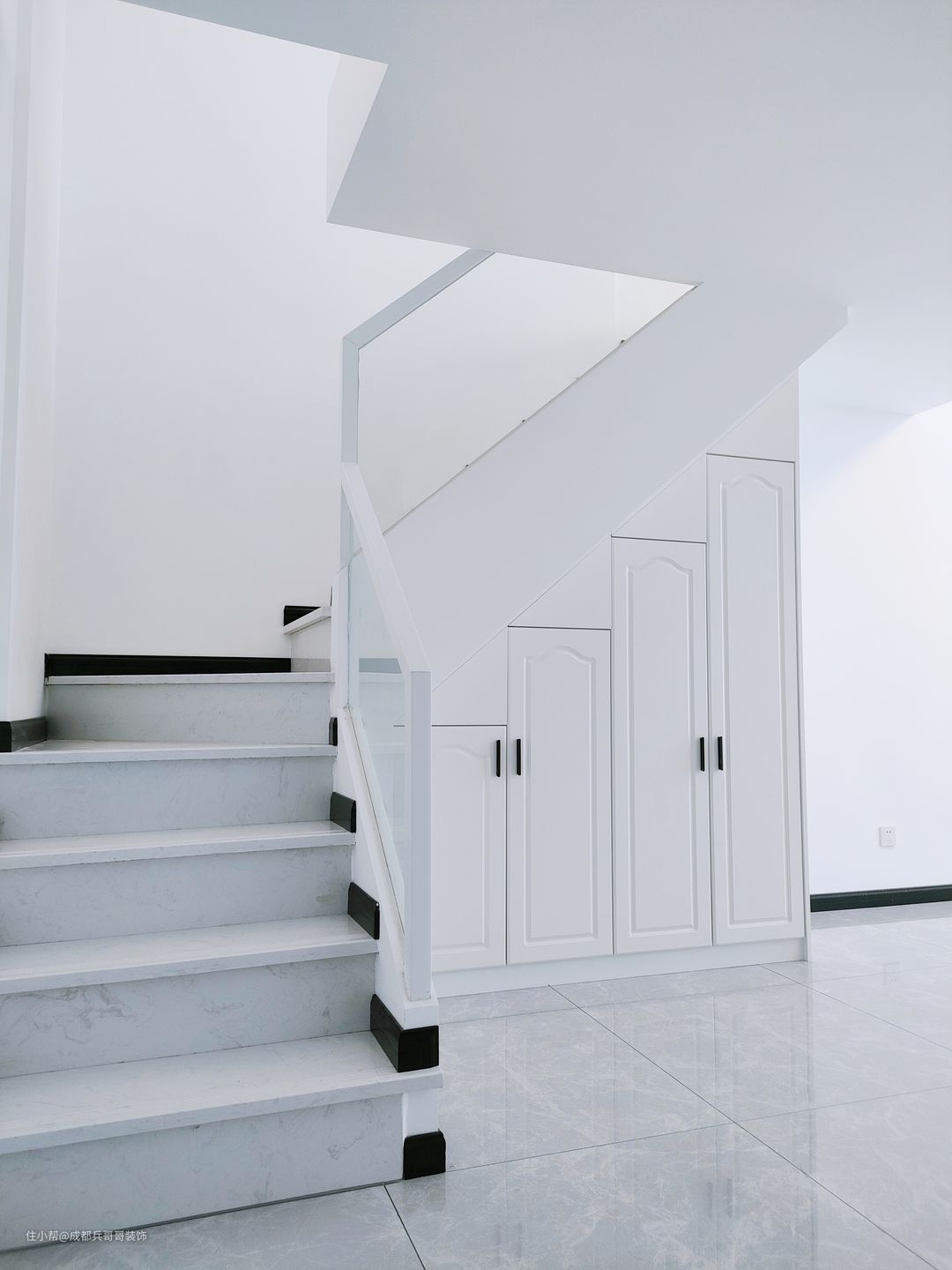 楼梯是一套公寓成形的关键点,这套选用7字形楼梯连接一二楼,大理石踏步+实木玻璃扶手+梯下餐边柜,简约大气又实用。踏步长80cm、宽23cm、高19.6cm,这个是根据常住人口身高设计的,上下楼梯会更舒适。