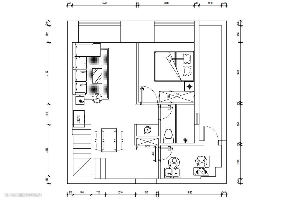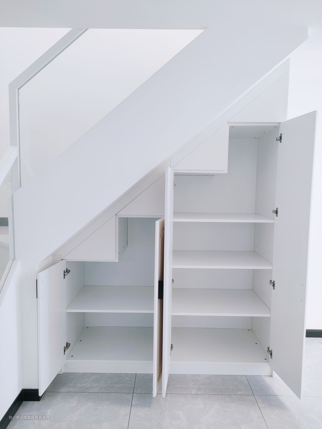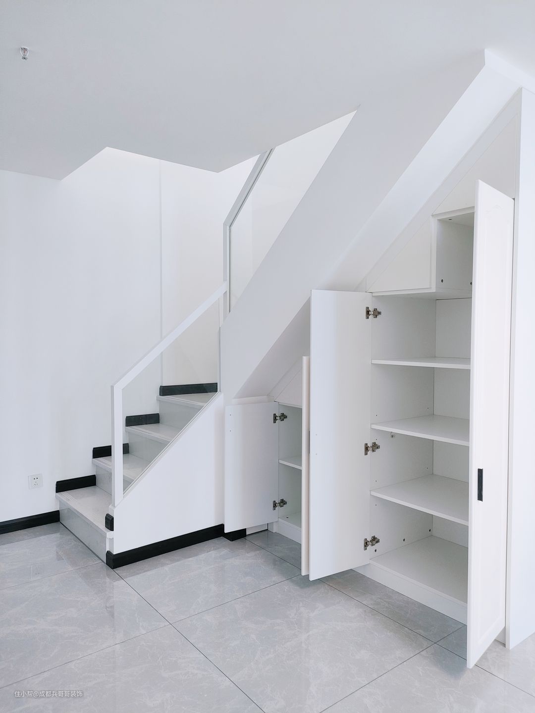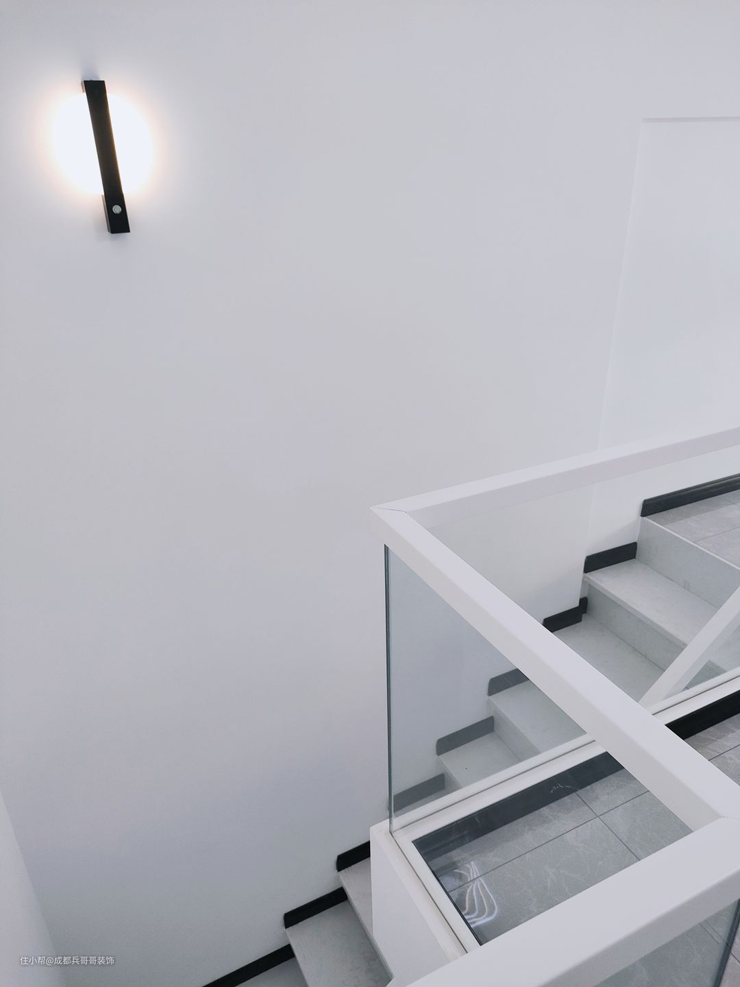 楼梯是一套公寓成形的关键点,这套选用7字形楼梯连接一二楼,大理石踏步+实木玻璃扶手+梯下餐边柜,简约大气又实用。踏步长80cm、宽23cm、高19.6cm,这个是根据常住人口身高设计的,上下楼梯会更舒适。