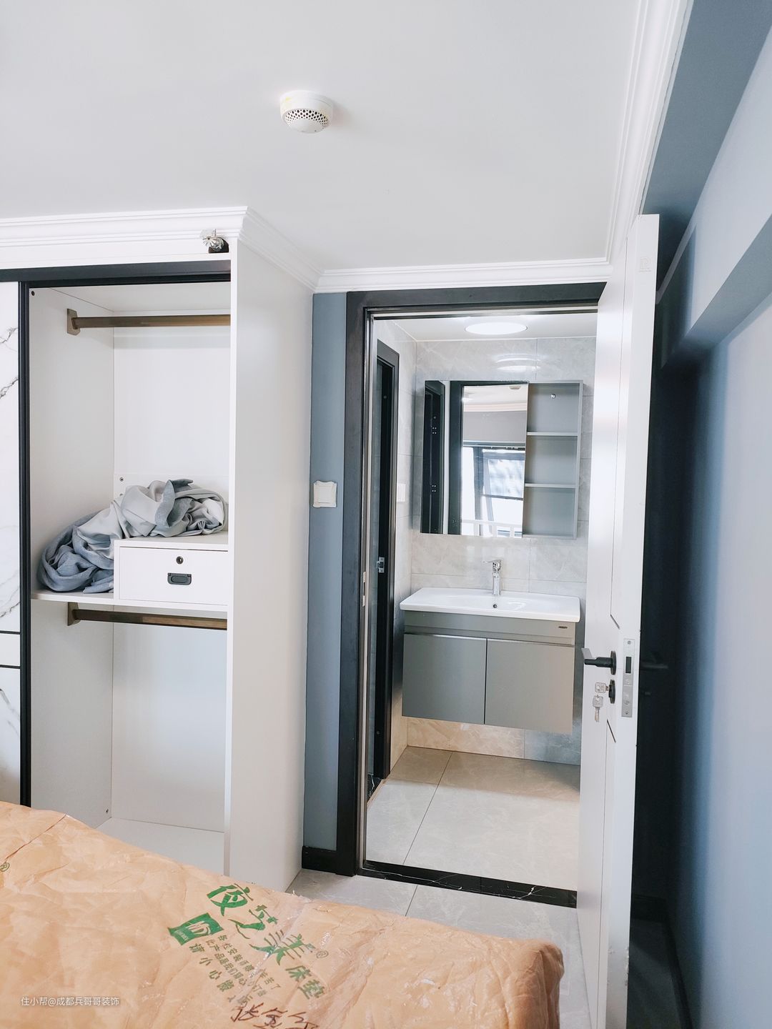 主卧,设计在2楼靠窗位置,通顶式衣柜+一米八大床+飘窗区,功能全面。飘窗这里也安装了扶手护栏,安全系数有保障,全屋的细节设计都是看得到的,很棒👍👍