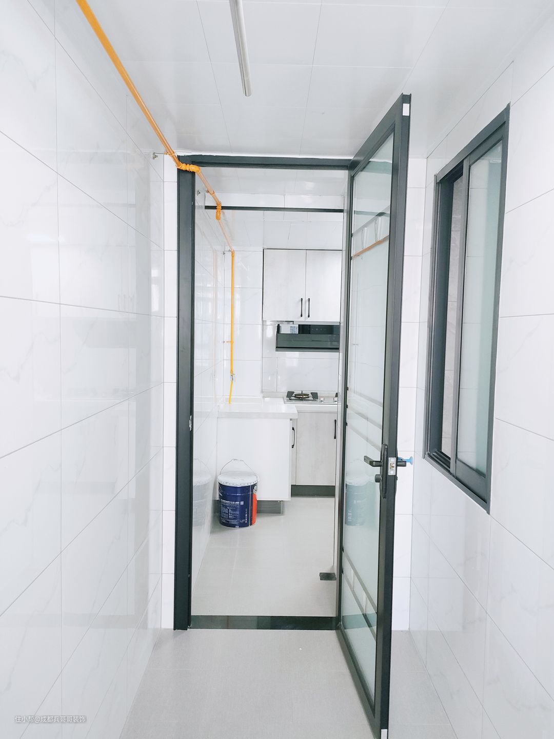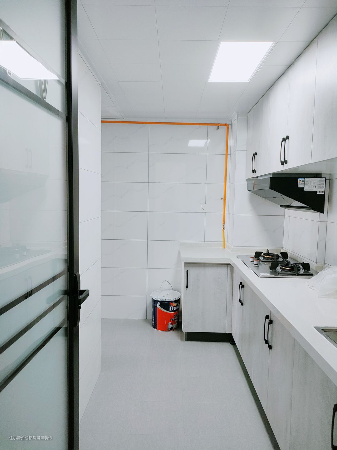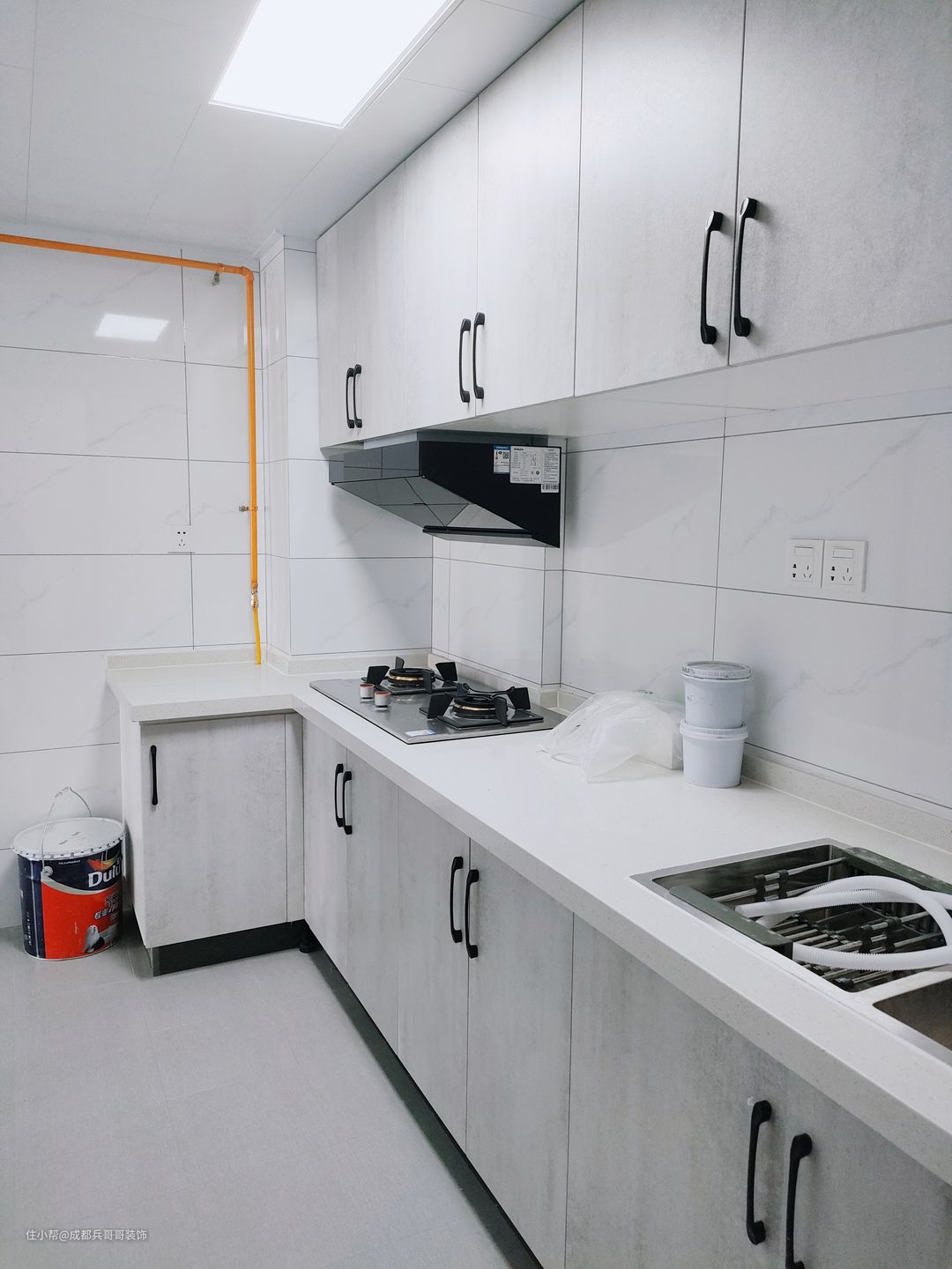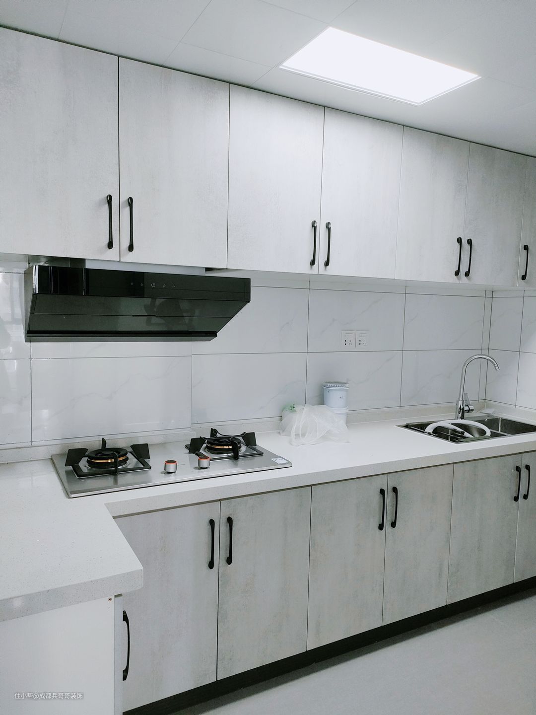 厨房,7字形格局,封闭式厨房设计,一整排的吊柜+地柜,收纳功能十足。整体色调以白色和灰色为主色调,简约干净。墙砖和地砖通铺整个空间,防水做了两遍,保证了很好的防水防潮效果,生活舒适性也更好。