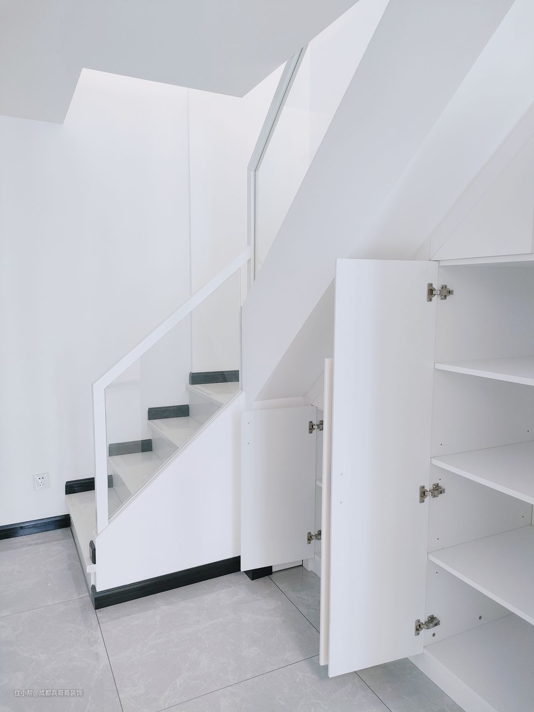 楼梯是一套公寓成形的关键点,这套选用7字形楼梯连接一二楼,大理石踏步+实木玻璃扶手+梯下餐边柜,简约大气又实用。踏步长80cm、宽23cm、高19.6cm,这个是根据常住人口身高设计的,上下楼梯会更舒适。
