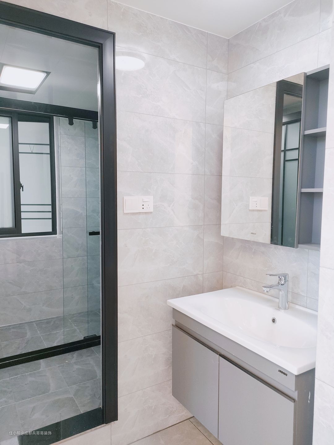 一二楼都设计的有卫生间,都是干湿分离得格局,外面浴室柜,里面是淋浴+马桶区,满足基本生活功能。墙砖、瓷砖同样通铺开来,浅灰色+白色设计,简洁又明亮,室内空间素雅、干净。
