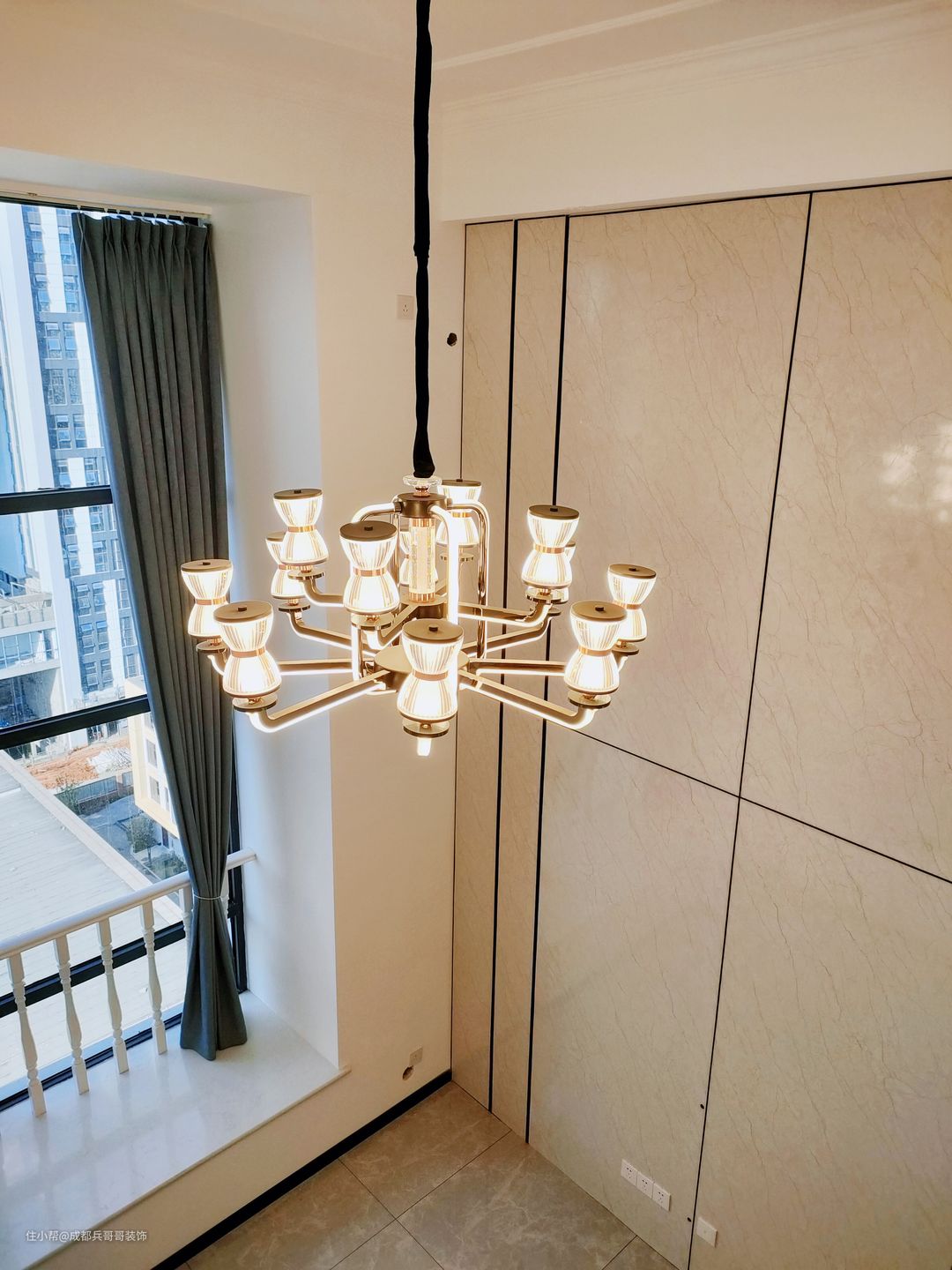 客厅,设计在镂空区域,拥有4米多的绝佳挑空感,给人带来的视野感辽阔、大气。 值得注意的是,沙发背景墙选用白色乳胶漆涂刷,电视背景墙则选用高光岩板拼接式设计,在不违背整体风格的前提下,节省成本又高端上档次。灯饰上,搭配的是复古式烛台水晶灯,营造出温馨浪漫的氛围感~~✨✨ 客厅保留了全景窗户,保证了室内的良好采光,设计师还贴心地设计了扶手护栏,生活安全性有效提高。飘窗台能改造成简单的休憩空间,闲暇时欣赏窗外的美景,放松身心也不错~~