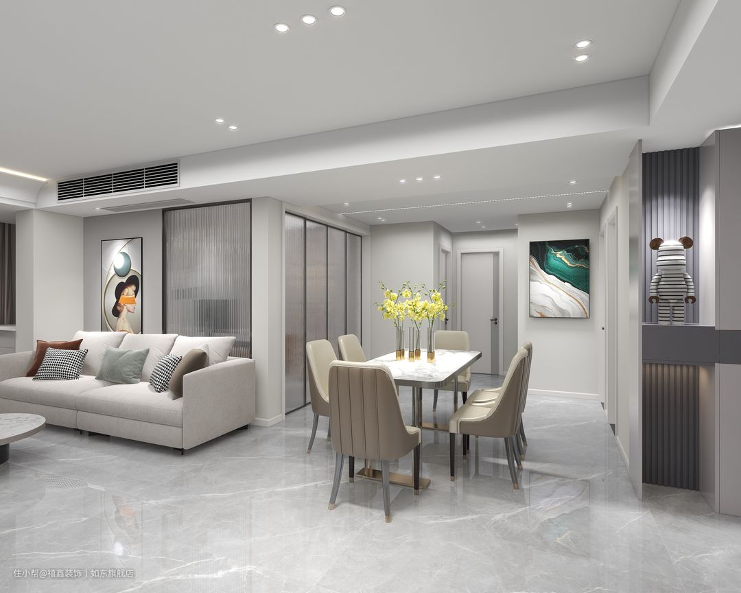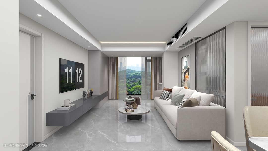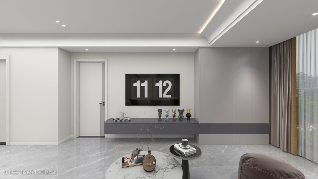 户主崇尚简约风,客厅采用无主灯设计,吊顶干净利落,在石膏顶周围安装了一圈灯带,增加了美观度。简约的大理石茶几衬托了户主亲近自然的独特品味!
