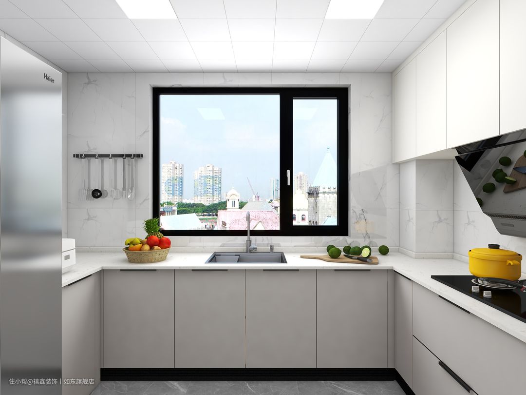 厨房采用封闭式设计,用玻璃推拉门嫩更有效的隔绝油烟,让空间更显自然清爽,纯色的U型设计也让厨房远离脏和乱,生活品质跃然纸上。