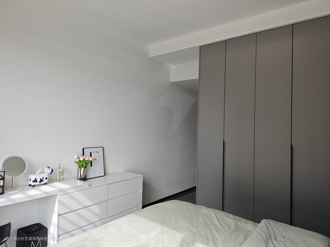 主卧通刷浅灰色乳胶漆,灰色比较助眠,容易让人安静下来;纸皮石膏板走了一圈双眼皮吊顶,简单耐看不藏灰,不过时;卧室衣柜选用环保类型的板材,柜体是多层板,柜门是颗粒平板门一门到顶的柜门加了拉直器,防止变形,黑色隐形拉手是关键,做成了单门,更简约一些。 这个梳妆台+斗柜不仅颜值高而且收纳能力超强,好看与实用并存呀!颜色是奶油白的,配上主卧背景岩石灰显得更温柔,把床尾空间利用起来,六个抽屉的斗柜也能装,日常的内衣还有日用品、首饰盒收纳储物都可以。 奶白色系软装起来也好搭配,配上一些装饰画、花瓶,旁边放置一个落地灯,主卧的氛围感就出来了。