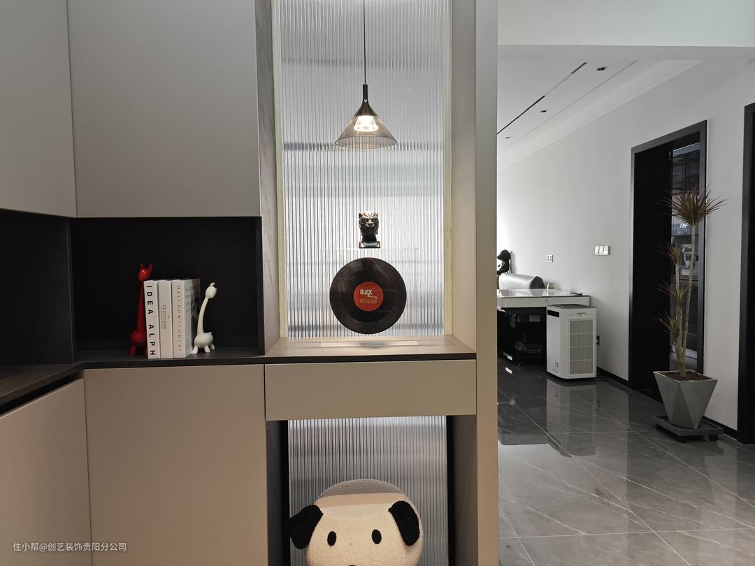 这个鞋柜一下就照到了我的心窝上,左右入墙式顶天立地鞋柜,满足进门居家储物需求,基于屋主对黑白灰+极简风的喜爱,整个柜体都选用高级灰色调,还有高颜值的长虹玻璃加持,不愧是年轻人的家,简直泰裤辣!!