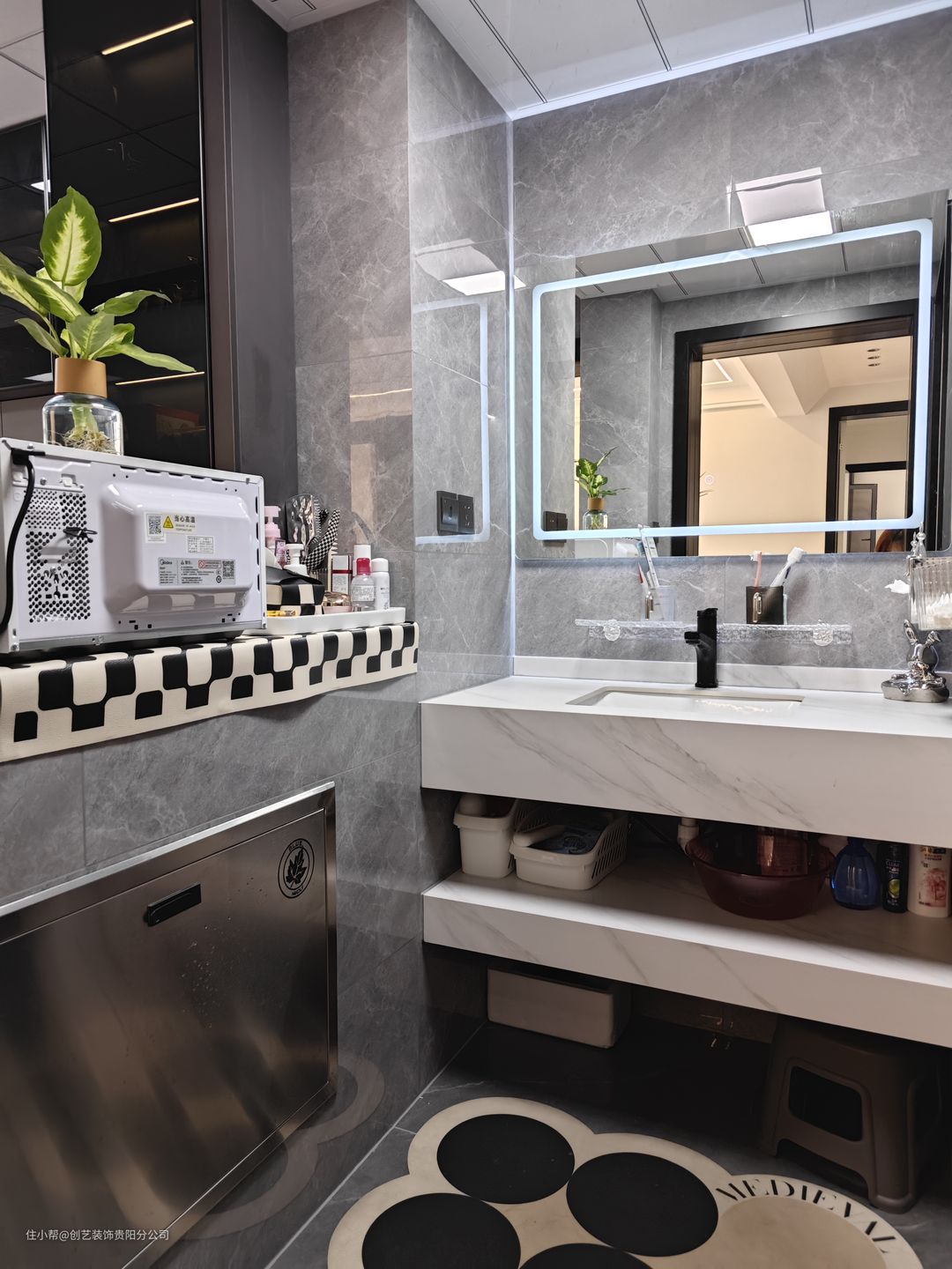 浴室小物件🖤黑白搭配永不过时🖤 很多人的浴室弄的花里胡哨,业主就比较喜欢黑白灰,灰色大理石卫生间耐脏又耐看,越用越香! 在软装上面有一些小心机和改变,黑白格纹的吸水脚垫和置物垫,都可以让这个浴室显得格外温馨。