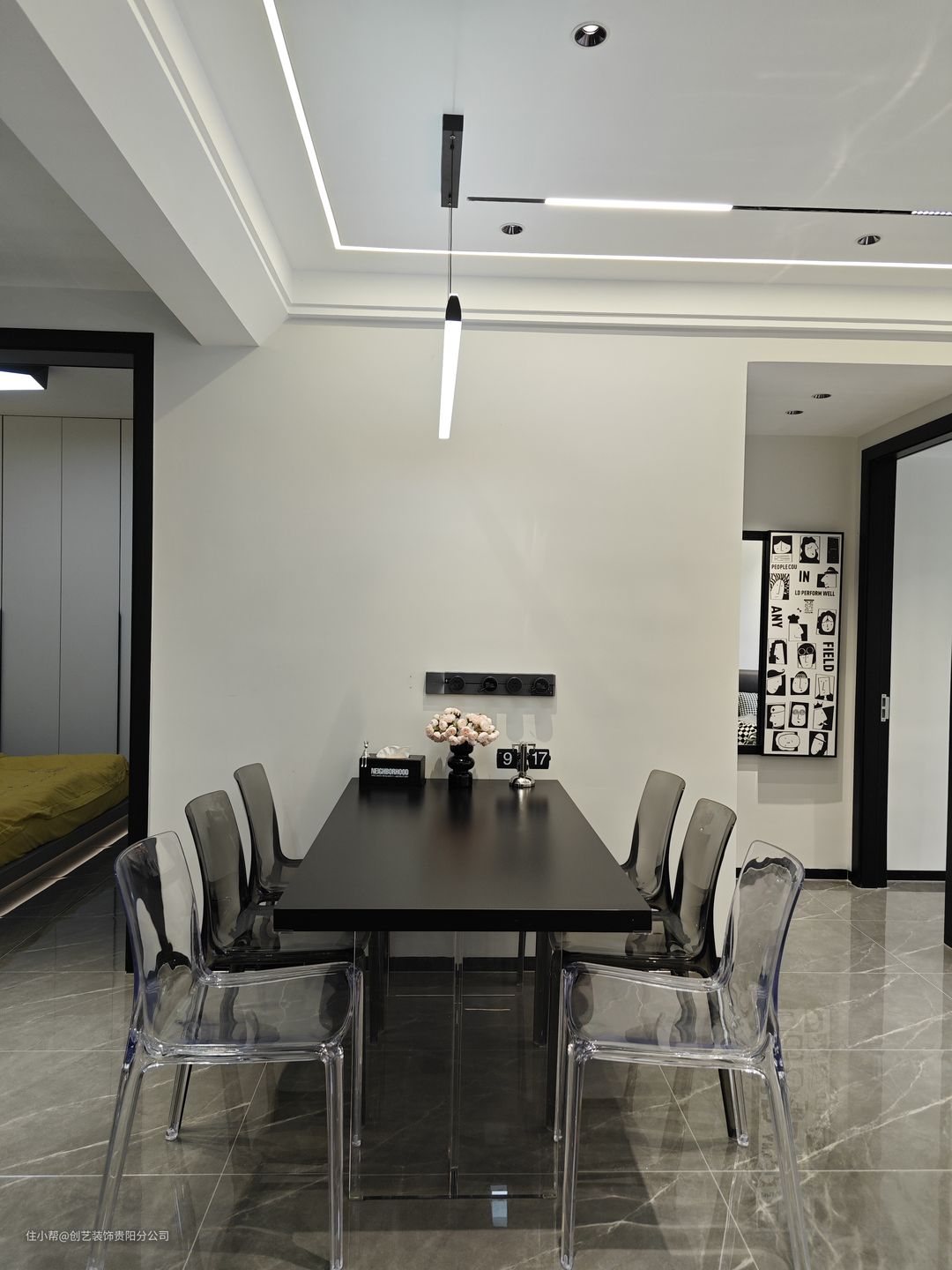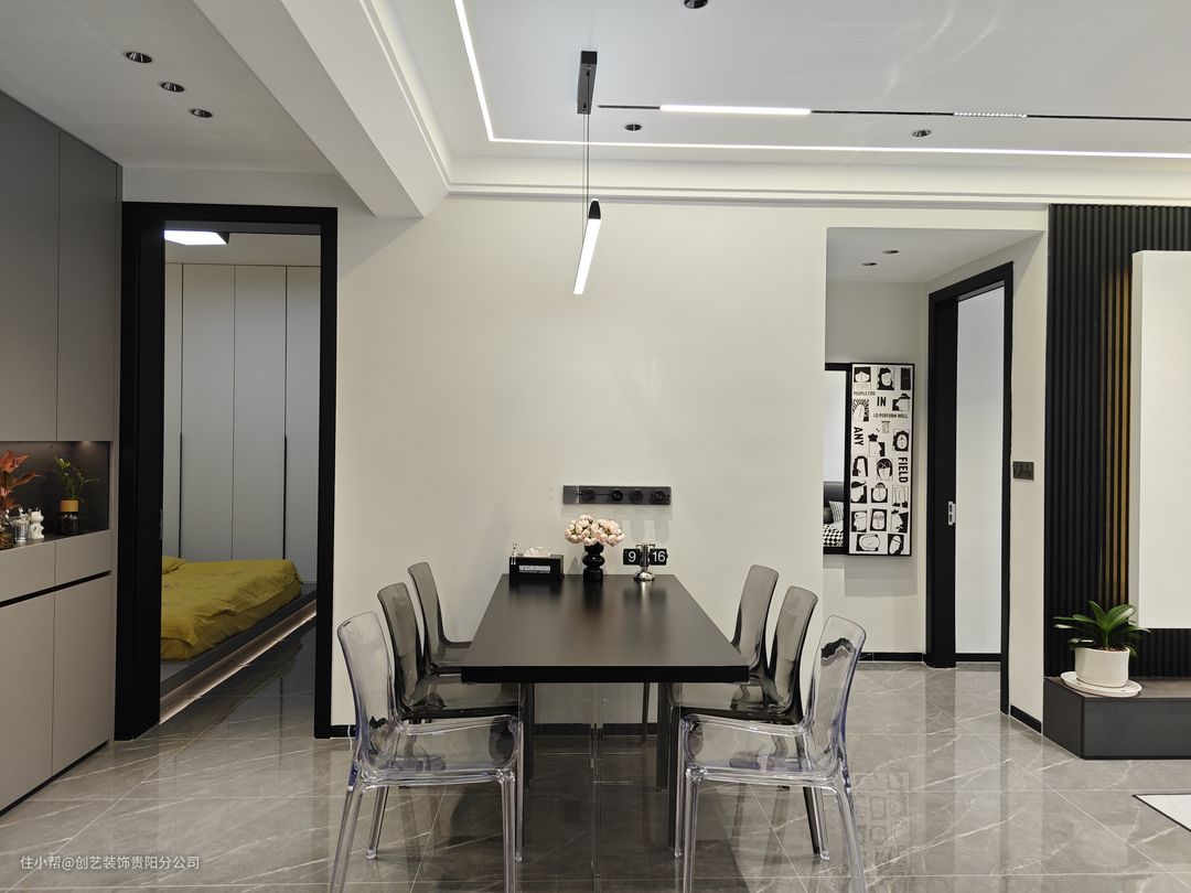 餐厅选用悬浮感设计的黑色餐桌,透明餐椅,远远望去,桌子就像悬浮在餐厅一样,跟普通餐桌一对比,它确实既轻盈又时尚,而且显得餐厅非常宽敞和明亮,这就是空间显大的秘诀!