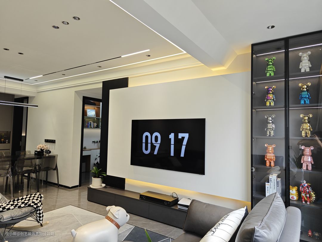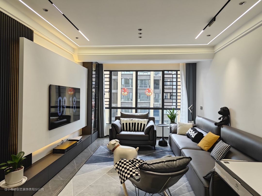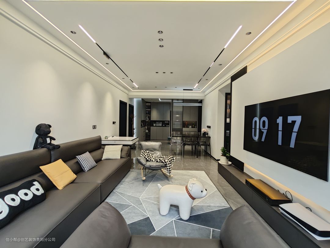 整体风格采用现代简约风格基调,采用黑白灰的空间设计,带来一种高级感的氛围;无主灯设计,在黑色与暖色设计感电视墙结合下,营造出一种自然舒适的感觉。