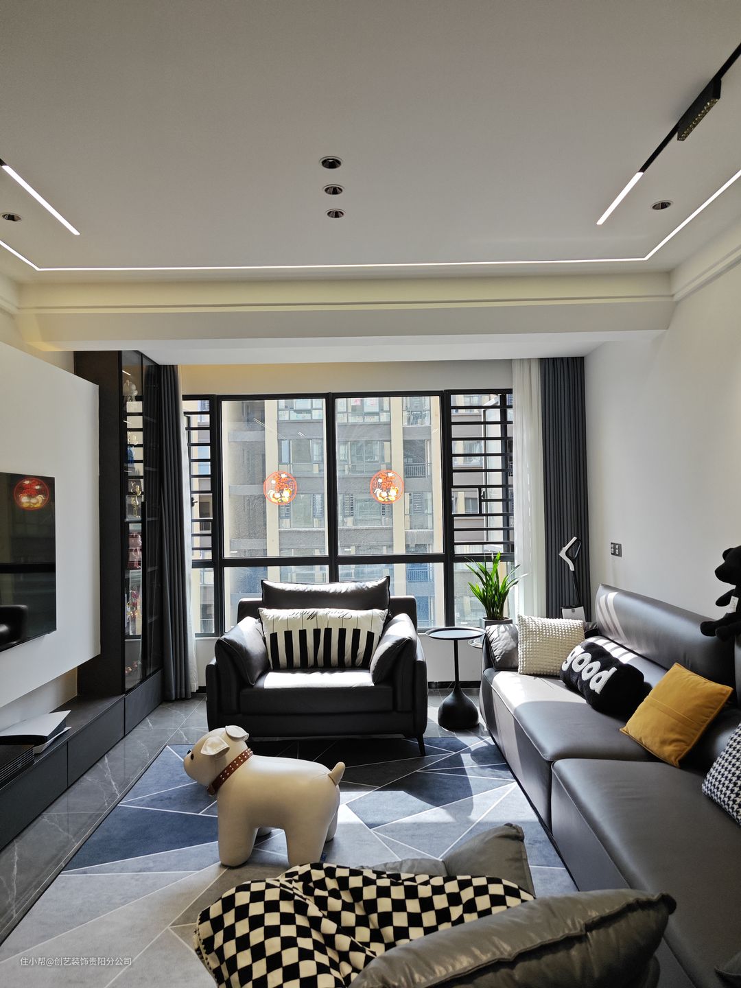 黑灰色皮质沙发,给宽阔通透的客厅增添些许高级气质,简约中透着精致感。