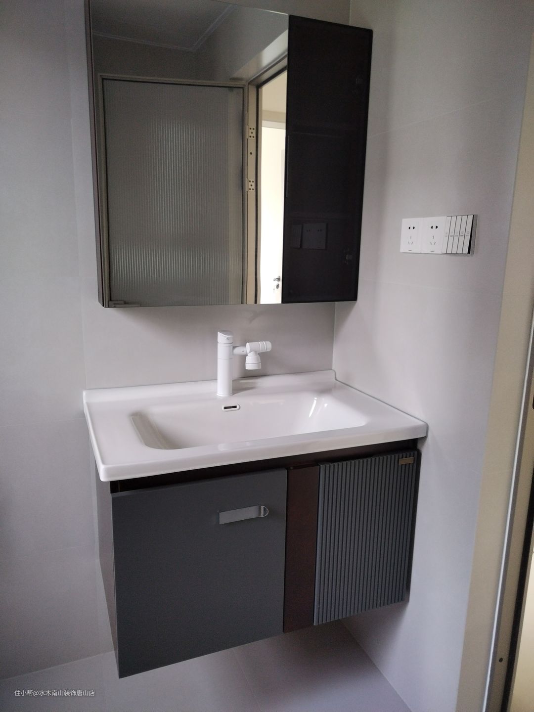 卫生间空间得到充分利用;墙地砖也是通体肤感,与客厅卧室更和谐一致;油砂玻璃门、黑色花洒、浴室柜呼应匹配;白色洗手池是亮点。