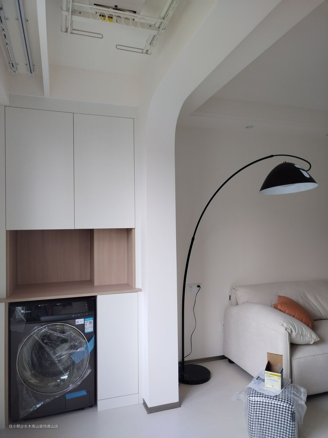阳台储物柜颜色配合了装修主色,白色柜体肤感触面;洗衣机嵌入其中,方便又安全!