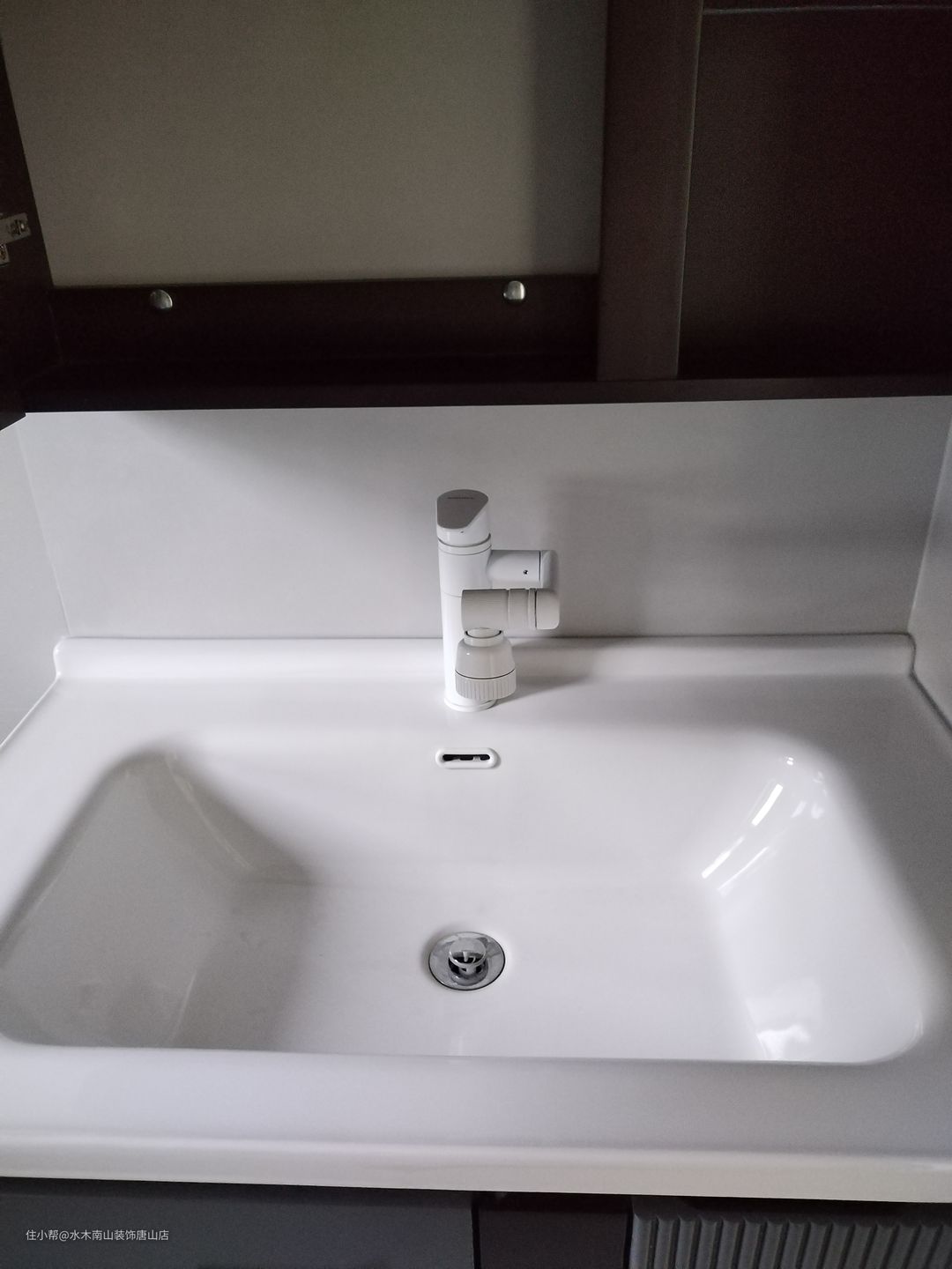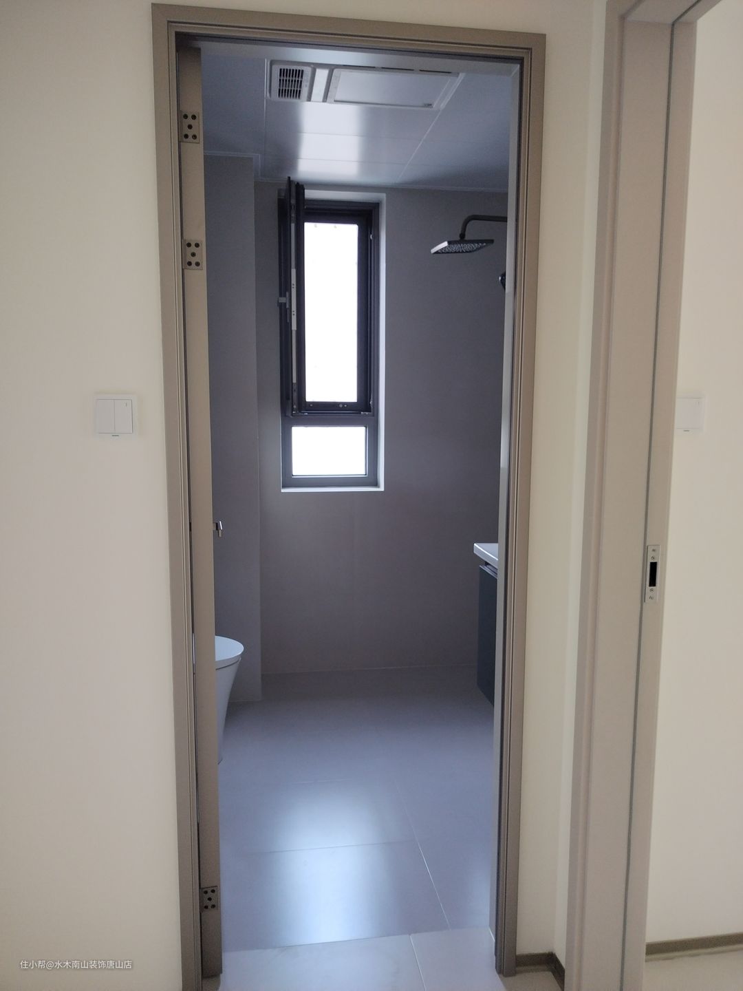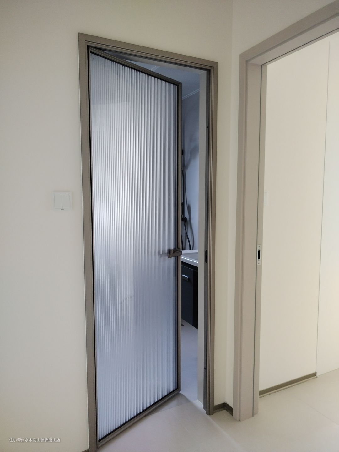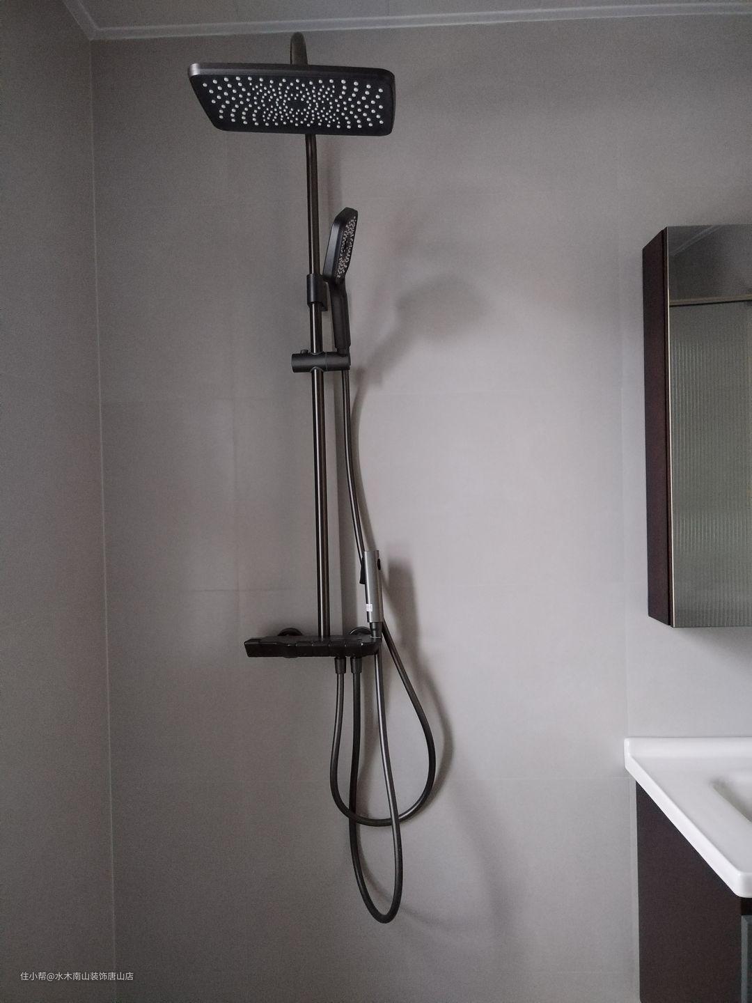 卫生间空间得到充分利用;墙地砖也是通体肤感,与客厅卧室更和谐一致;油砂玻璃门、黑色花洒、浴室柜呼应匹配;白色洗手池是亮点。