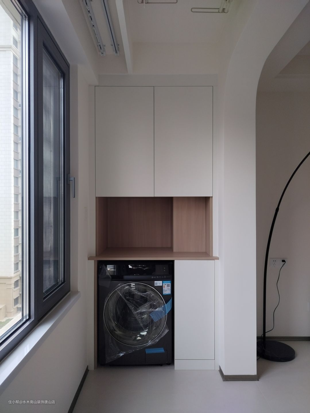阳台储物柜颜色配合了装修主色,白色柜体肤感触面;洗衣机嵌入其中,方便又安全!