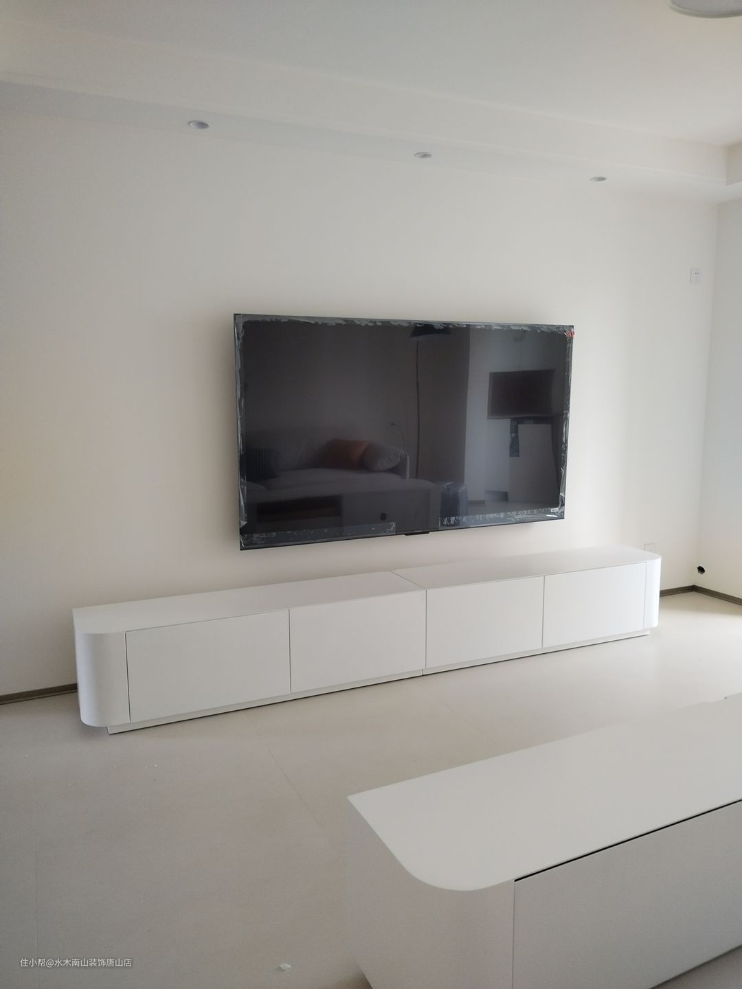 简单电视背景墙配合简约型电视柜、白色直排沙发,视觉延伸感更强。