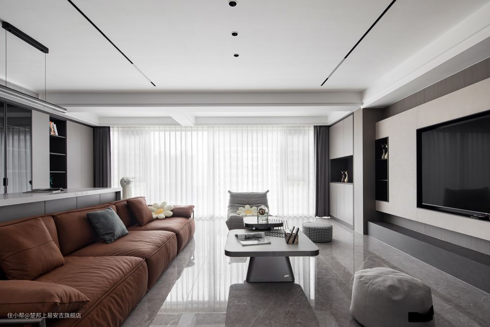 客厅为横厅设计,顶部采用无主灯设计,线条流畅。以黑白+浅原木色为主调,搭配复古棕橘色沙发,为整体增加一分轻松活跃。客厅纯色电视背景墙,一字型电视柜,使得空间干净利落,简约又不失格调。