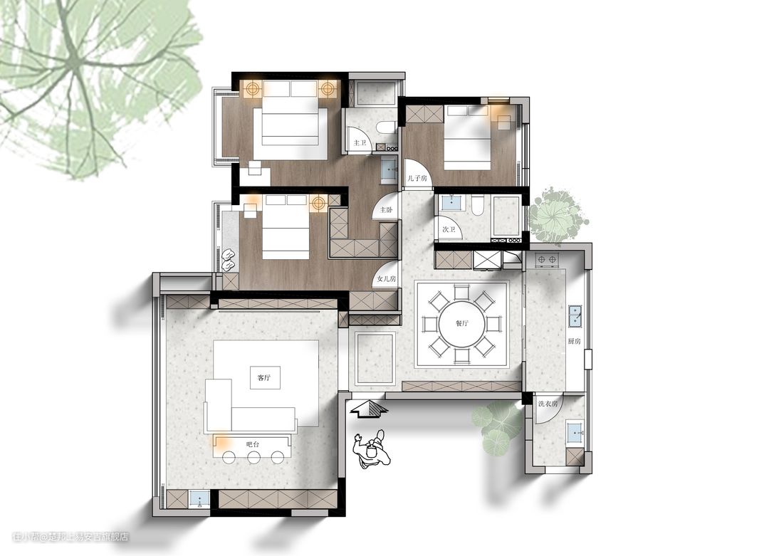 来到餐厅,入目便是六人位圆形餐桌。位置紧挨厨房,生活动线较短,更利于摆放菜品,提升家庭用餐体验。餐桌后面设置一列极具质感的餐边柜,增加储物空间的同时,也让房屋布局变得更加整齐。