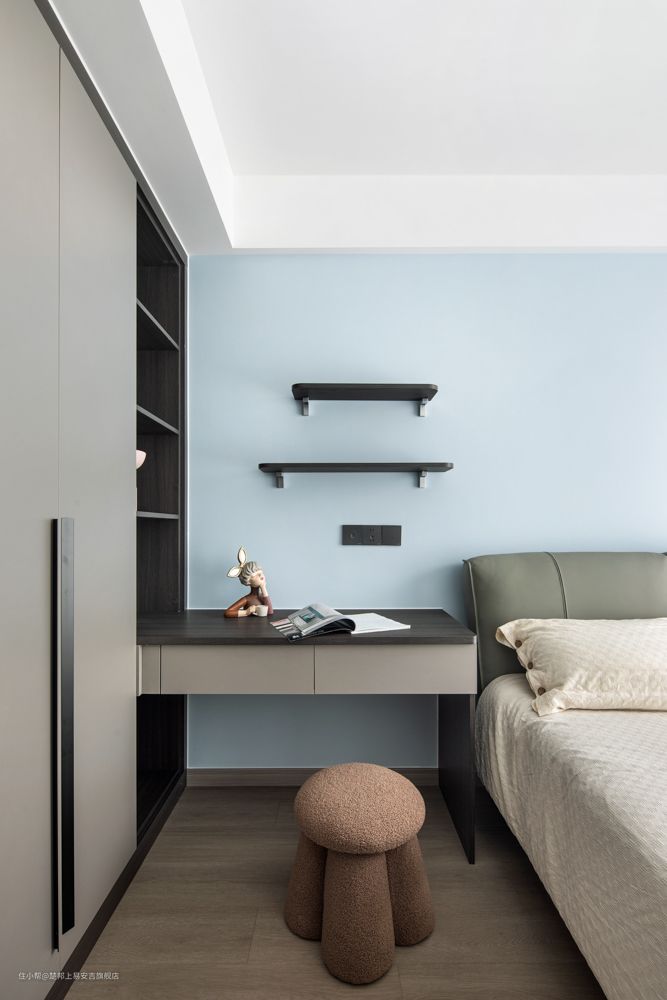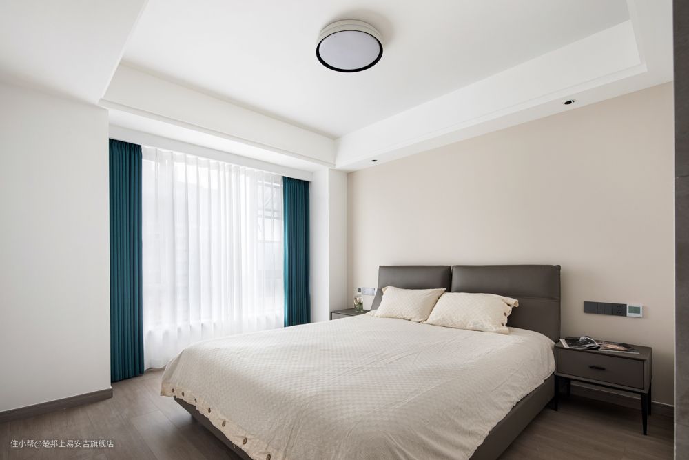 主卧摒弃过于复杂元素,整体色调以白色+墨绿色为主,奶白色墙面为整体氛围增加一份温暖。床头顶部内嵌灯带,点缀出精巧和雅致,营造舒适睡眠氛围。