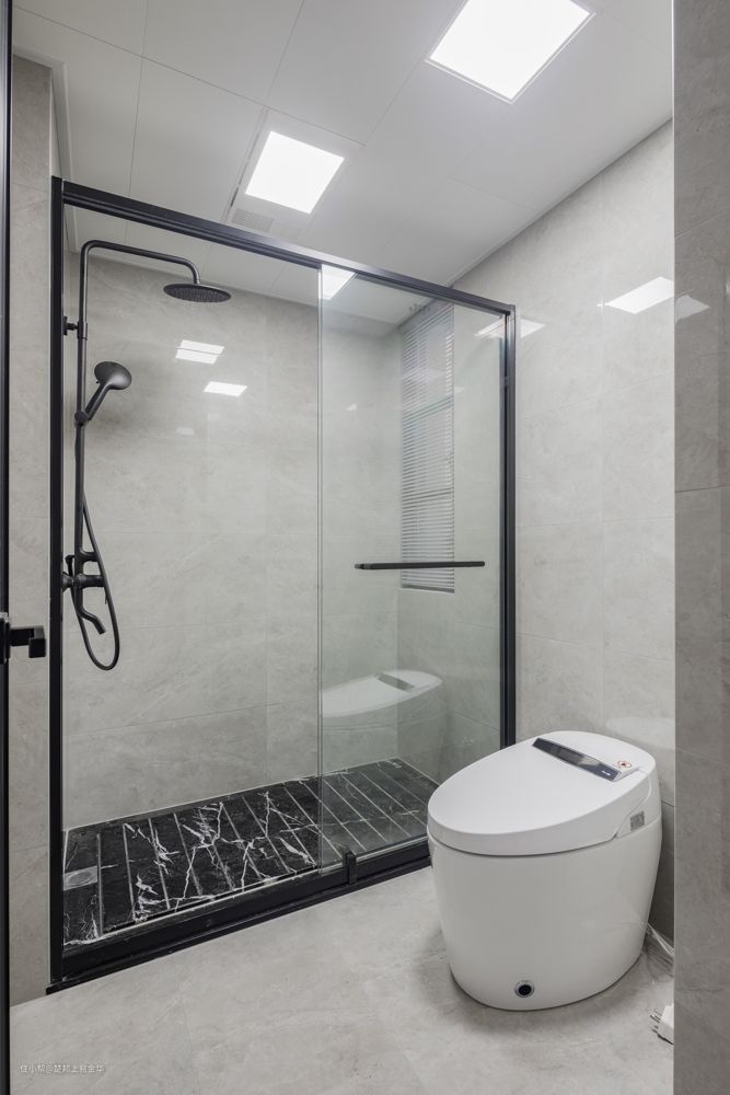卫生间部分采用透明玻璃和黑色铝合金做到干湿区分,实用感满满。通铺的浅黄色地砖,让整个区域更显简约大气。