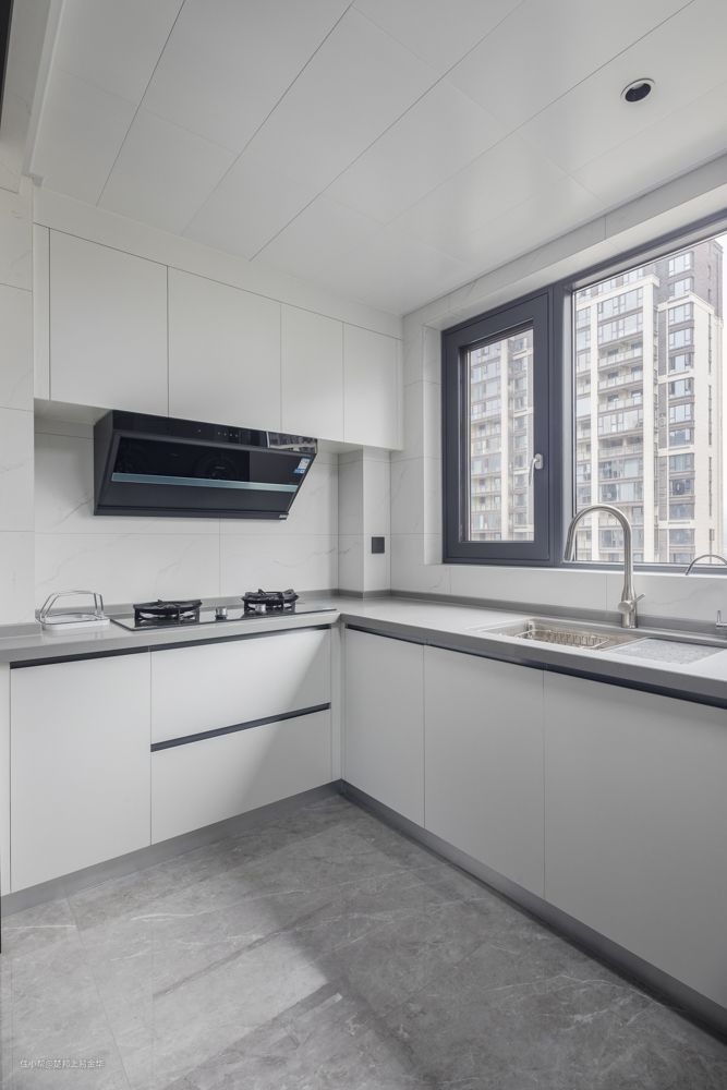 厨房采用L型设计,抽屉型橱柜,增加厨房收纳空间。厨房整体为纯白色为主,满足屋主对纯净视觉的要求。