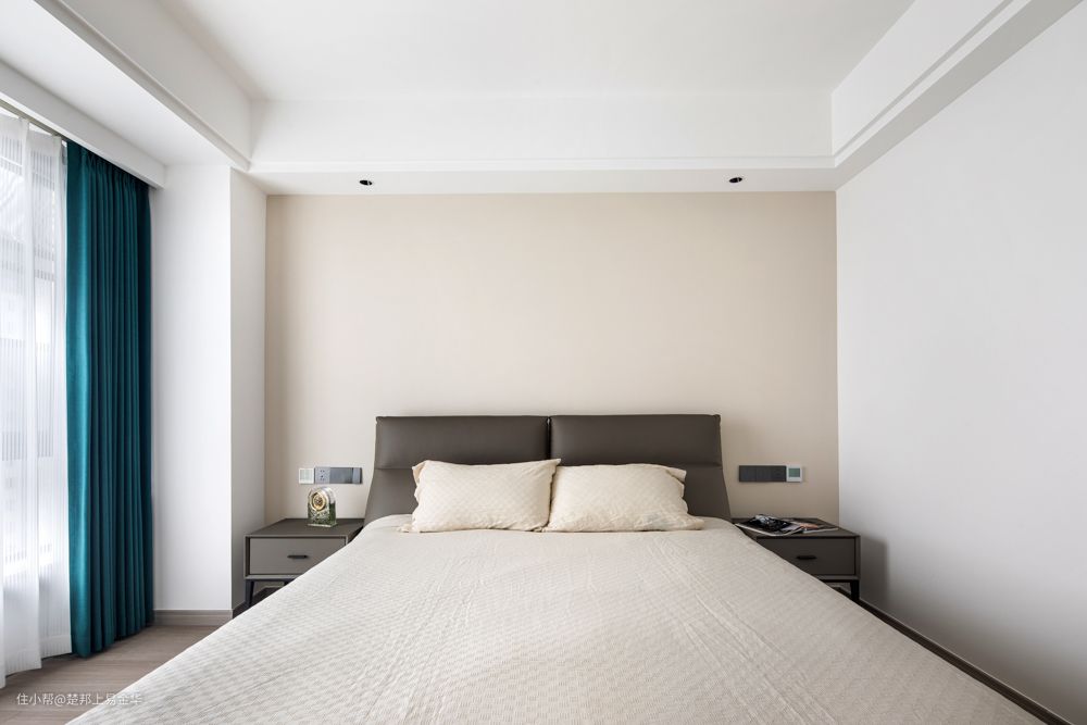 主卧摒弃过于复杂元素,整体色调以白色+墨绿色为主,奶白色墙面为整体氛围增加一份温暖。床头顶部内嵌灯带,点缀出精巧和雅致,营造舒适睡眠氛围。
