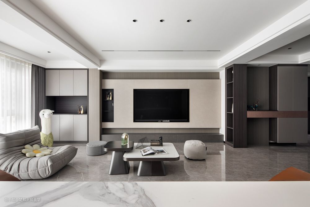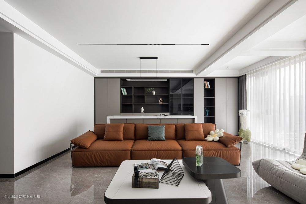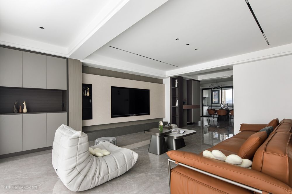 客厅为横厅设计,顶部采用无主灯设计,线条流畅。以黑白+浅原木色为主调,搭配复古棕橘色沙发,为整体增加一分轻松活跃。客厅纯色电视背景墙,一字型电视柜,使得空间干净利落,简约又不失格调。