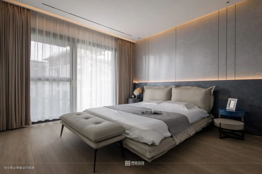 主卧是简约灰调,采用无主灯设计通过灯带来烘托温馨的氛围,选用原木做地板,脚感更好。床头背景墙是黑灰两种颜色设计,提升空间质感。