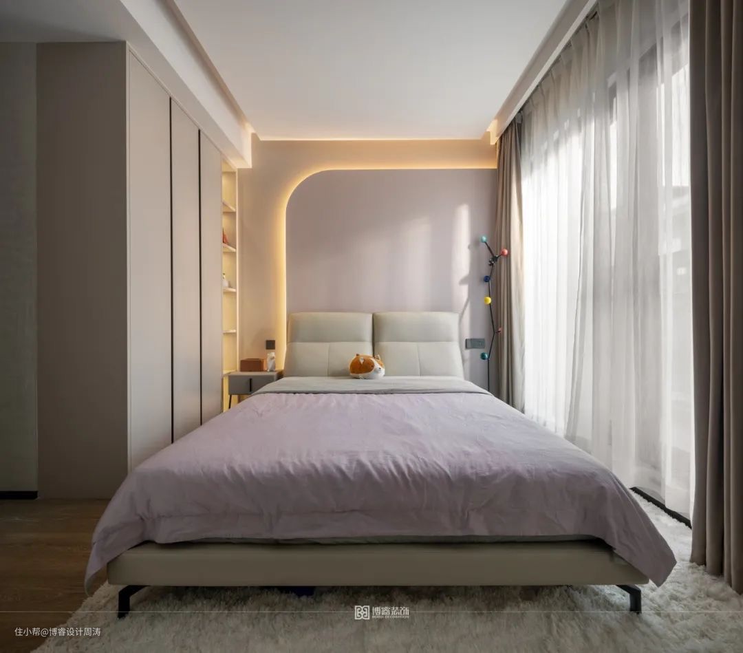 女孩房则加入了一些感性的粉色元素,粉色背景墙搭配粉色床品,满满的少女气息扑面而来。窗边设计书桌+开放式书柜作为孩子的学习区域,日常可以在此看书学习等。