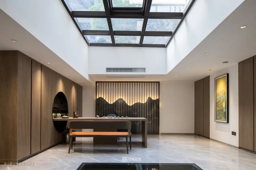 负一层作为接待朋友的区域,在二、三层现代基础上融入抽象的中式元素。原先天井位置,天花设计成阳光顶,这样在负一层也能感受到阳光的温暖,也为空间带来无垠的视觉观感。