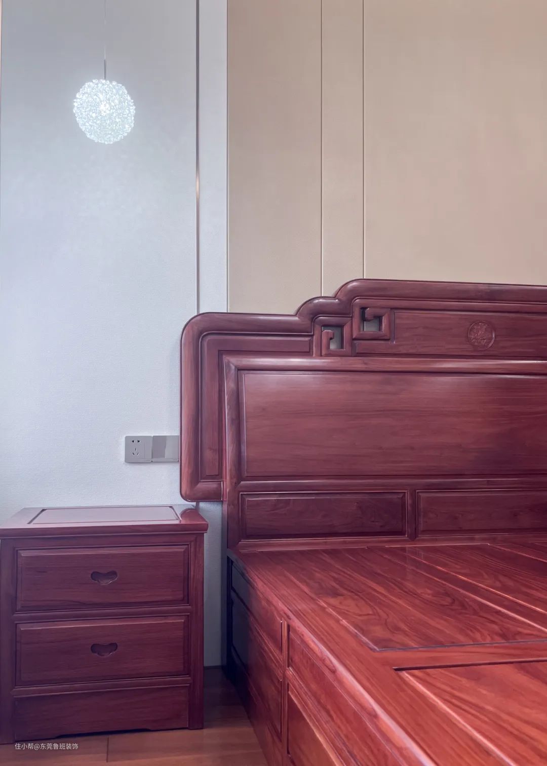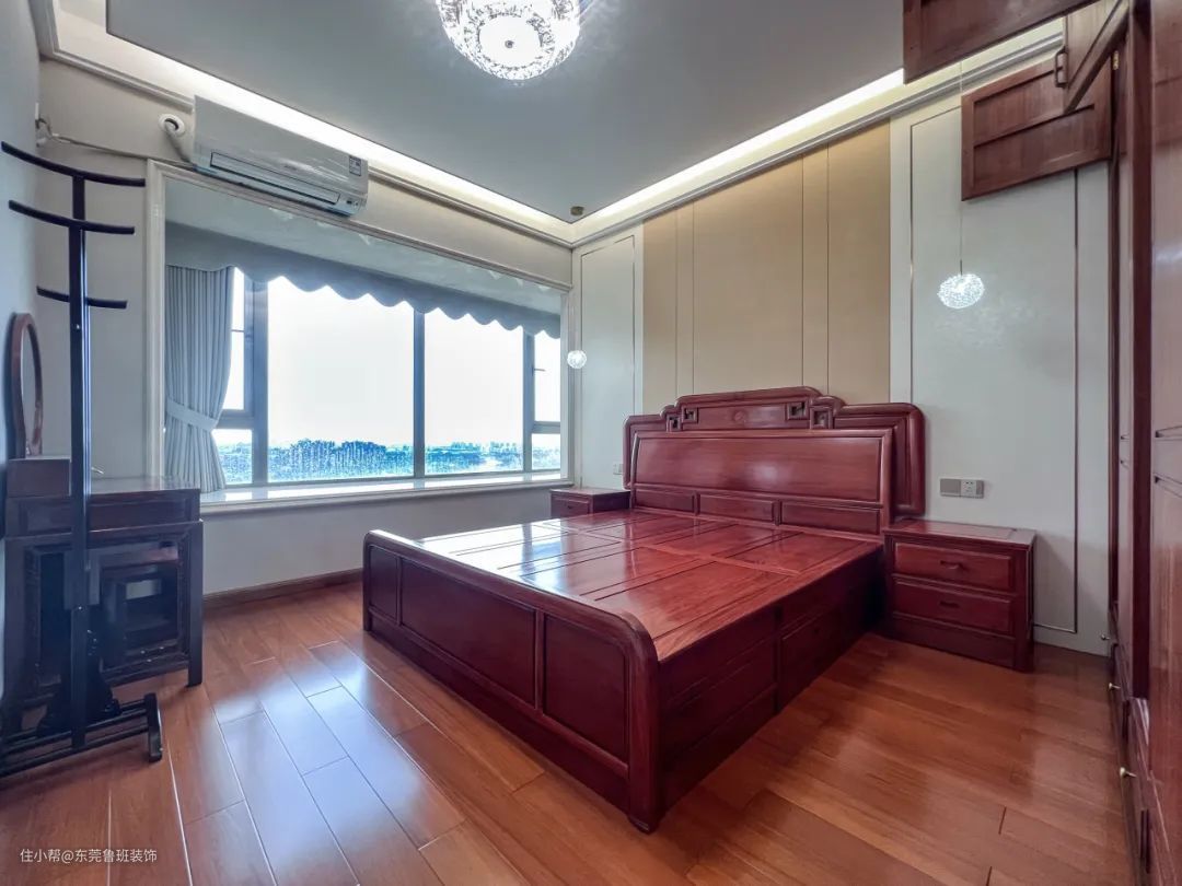 于主卧空间,温润的木地板与柜体仿佛一气呵成,水晶灯饰玻璃元素的植入恰到好处的与浅调墙面相互映衬,营造出时尚却显浮夸的空间氛围。 作为身心休憩的港湾,卧室区域没有过多坠饰,化繁为简,纯粹自然。素色帘幔后是一位治愈系画家,四季更迭,节气变化,所有美好尽收眼底,