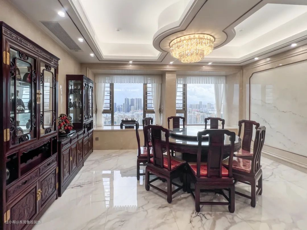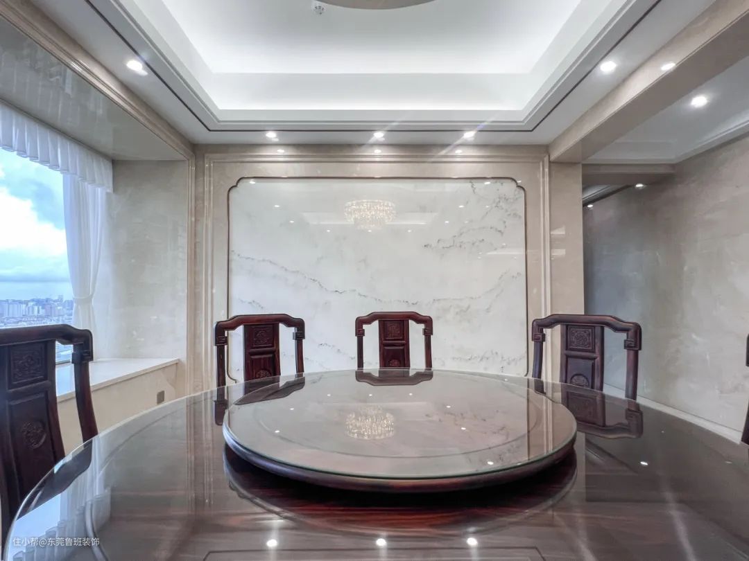餐厅与客厅风格一脉相承。方形吊顶与圆形餐桌,打破古代“天圆地方”的说法。顶上流畅简约的线条设计与中式传统实木餐椅,是现代元素与古典风格的巧妙融合,衍生出简约大气、格调高雅的新中式空间。 用餐区左侧实木餐边柜的精致传统与右侧大理石背景墙的简练自然形成鲜明对比,营造出一种明暗适宜、冷暖有度的视觉冲击。