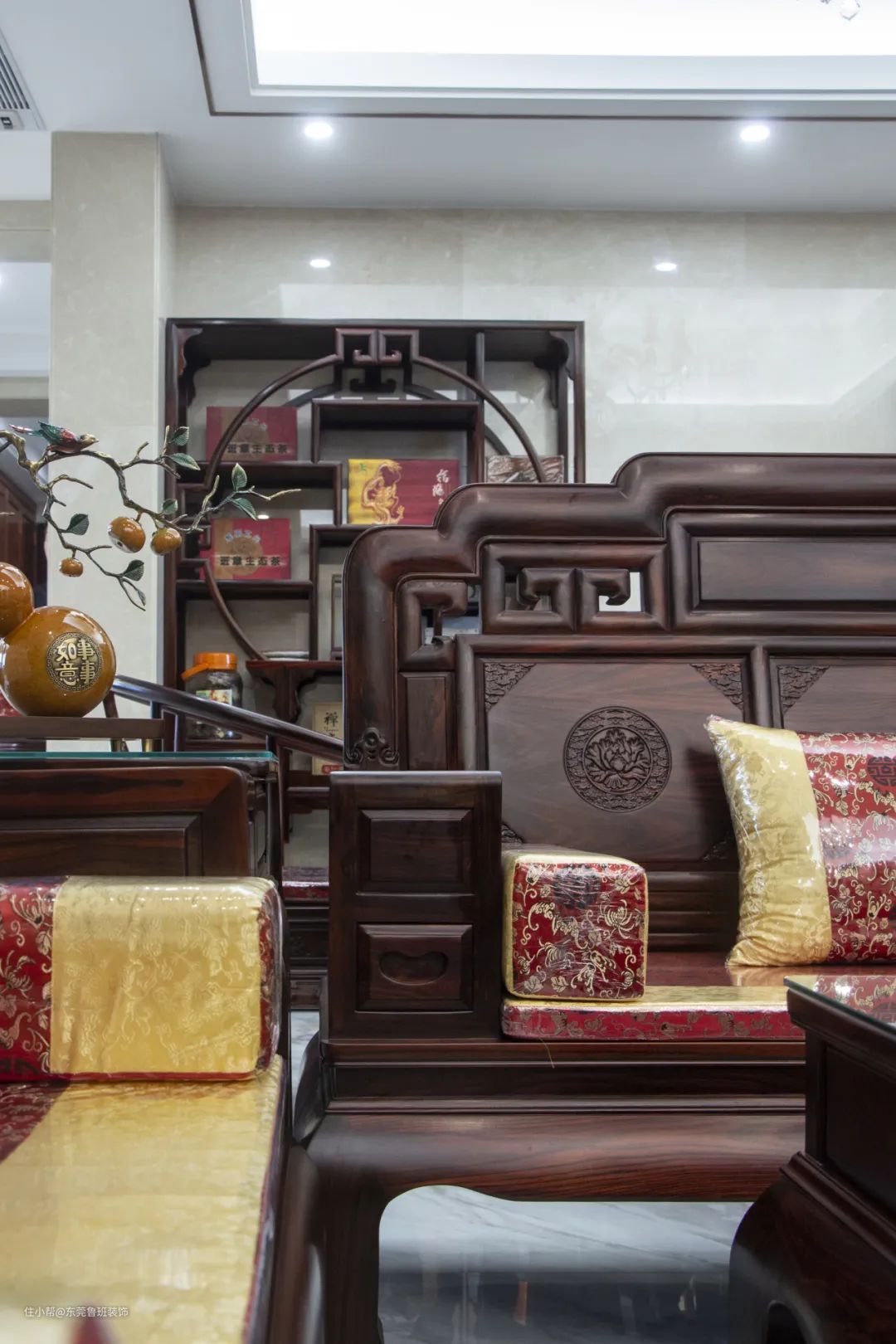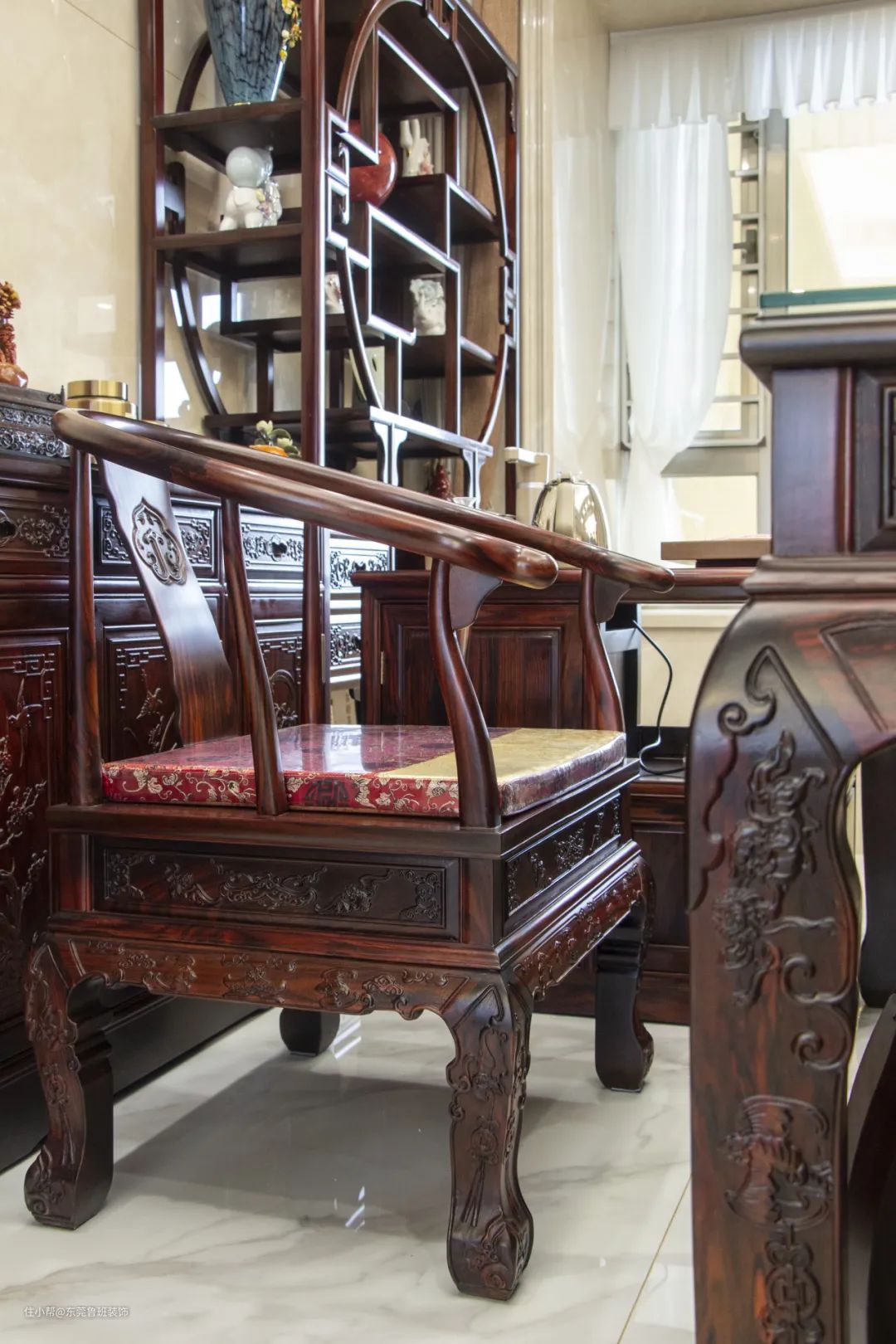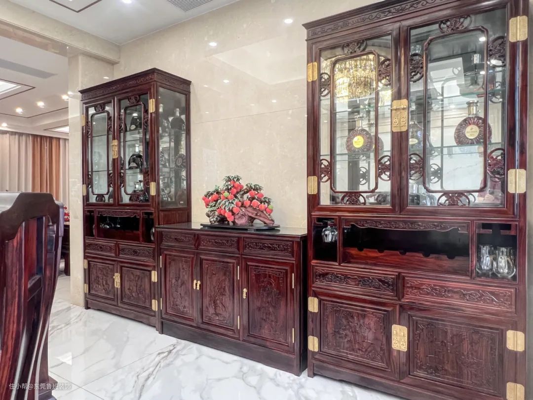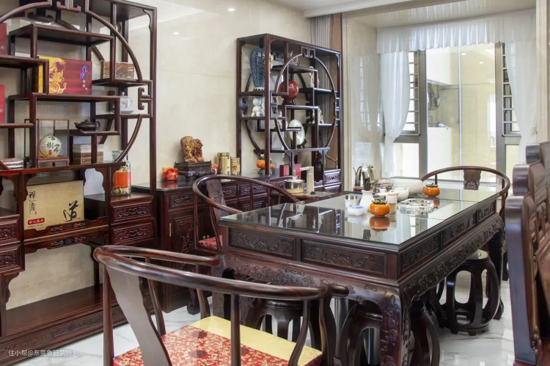 茶文化在中国已流传沉淀多年,居雅室,品茗香。在家中打造一间古风典雅的茶室,沏一壶好茶,三五好友,细品袅袅茶香,未尝不是现代生活中返璞归真的诗意栖居。 东方之美于每一件家具器物的造型细节上体现得淋漓尽致。实木天然浑厚的气质与精美流畅的雕刻花纹相搭,全然显现出自然与人文的完美融合。