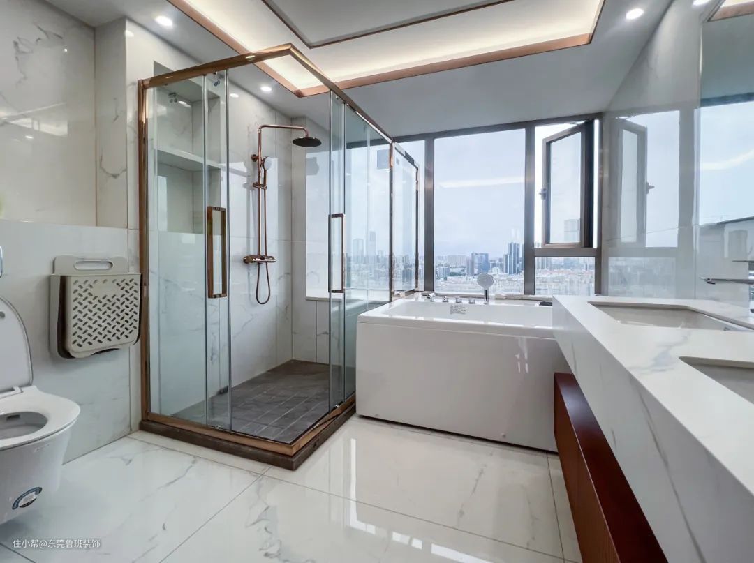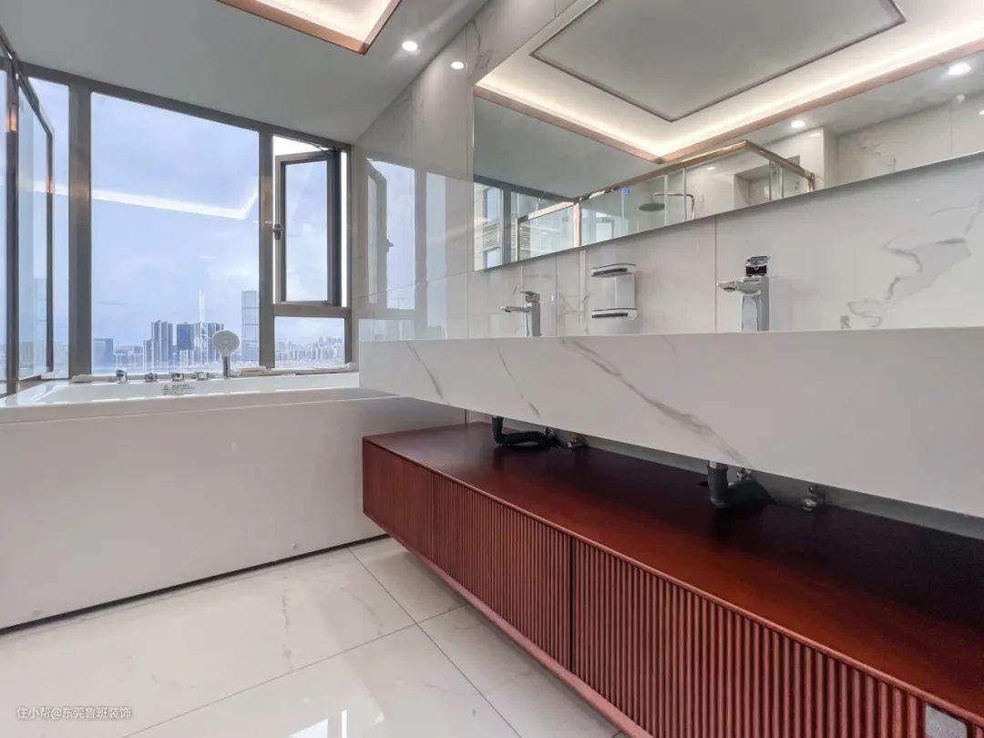 浴室整体选用了浅色大理石纹瓷砖,色彩上缓解了沉重的压抑感,进入浴室那一刻,便卸下一天的疲倦,享受属于自己私人的静谧时光。