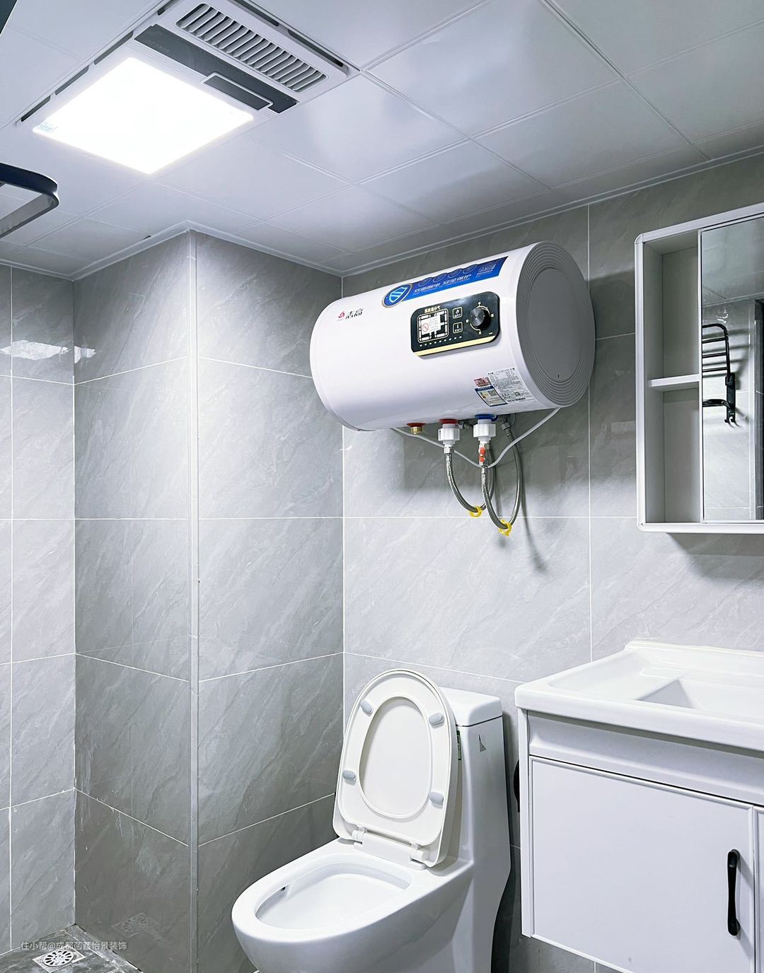 卫生间墙砖,地砖同色,整体性更强。白色浴室柜中和空间色调,更舒适。